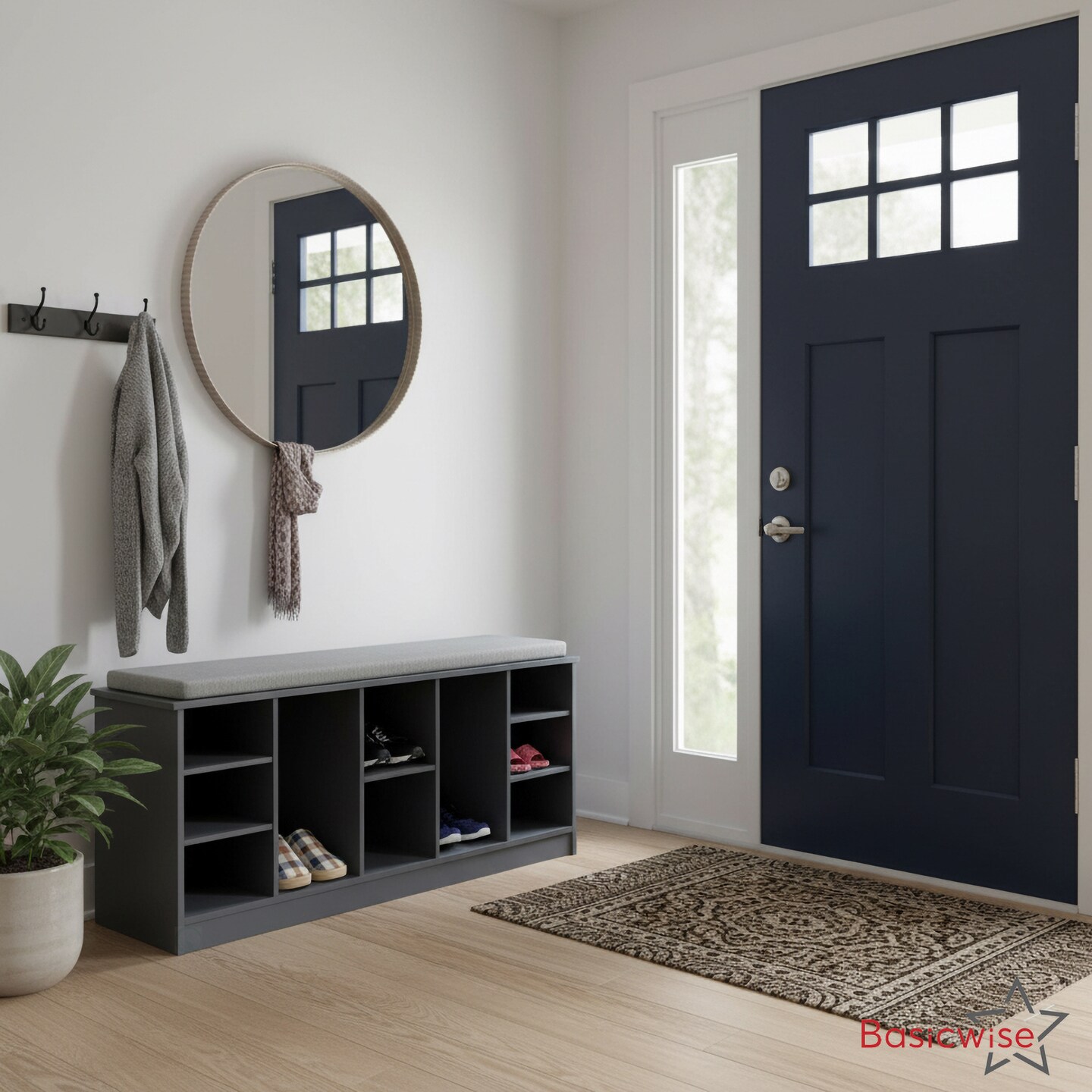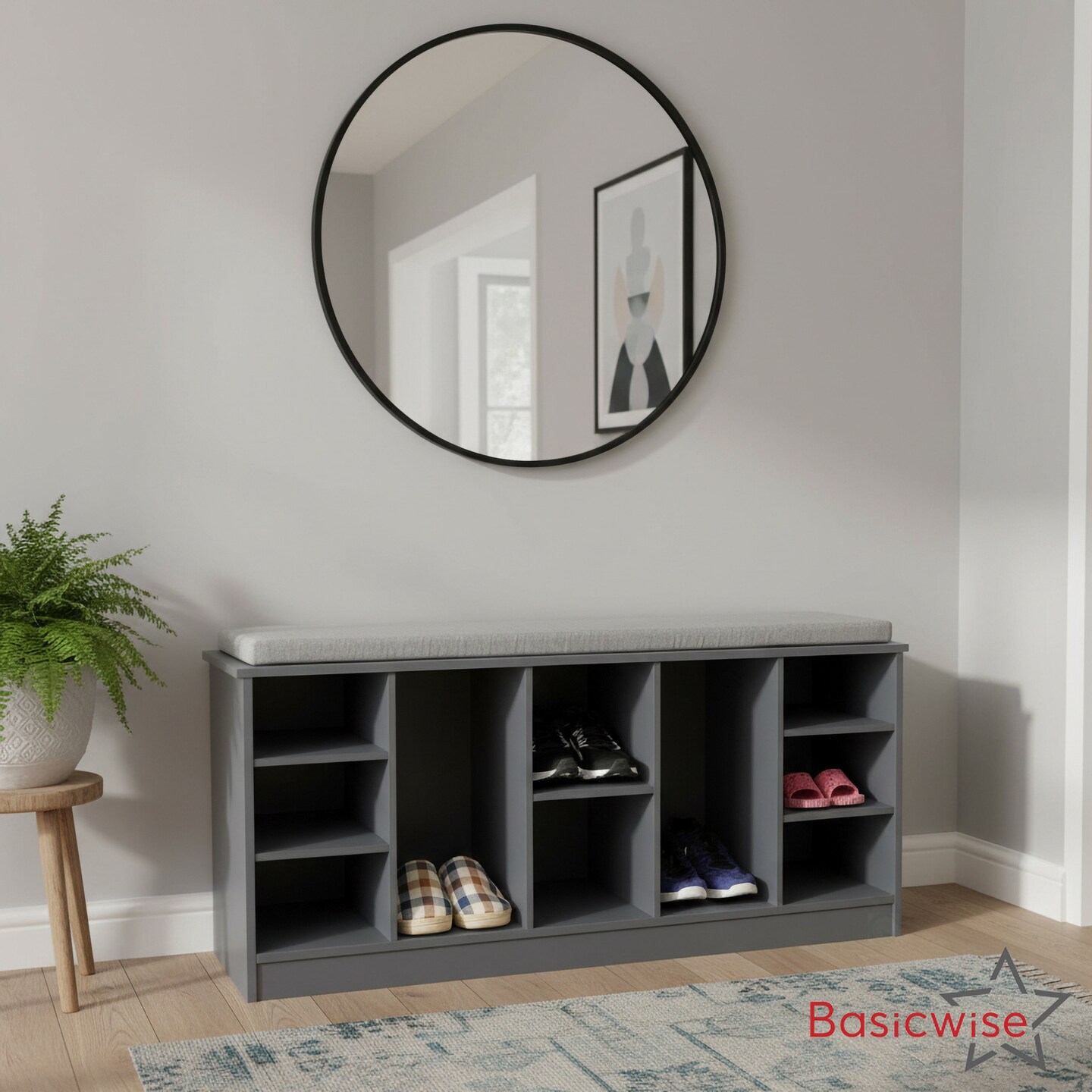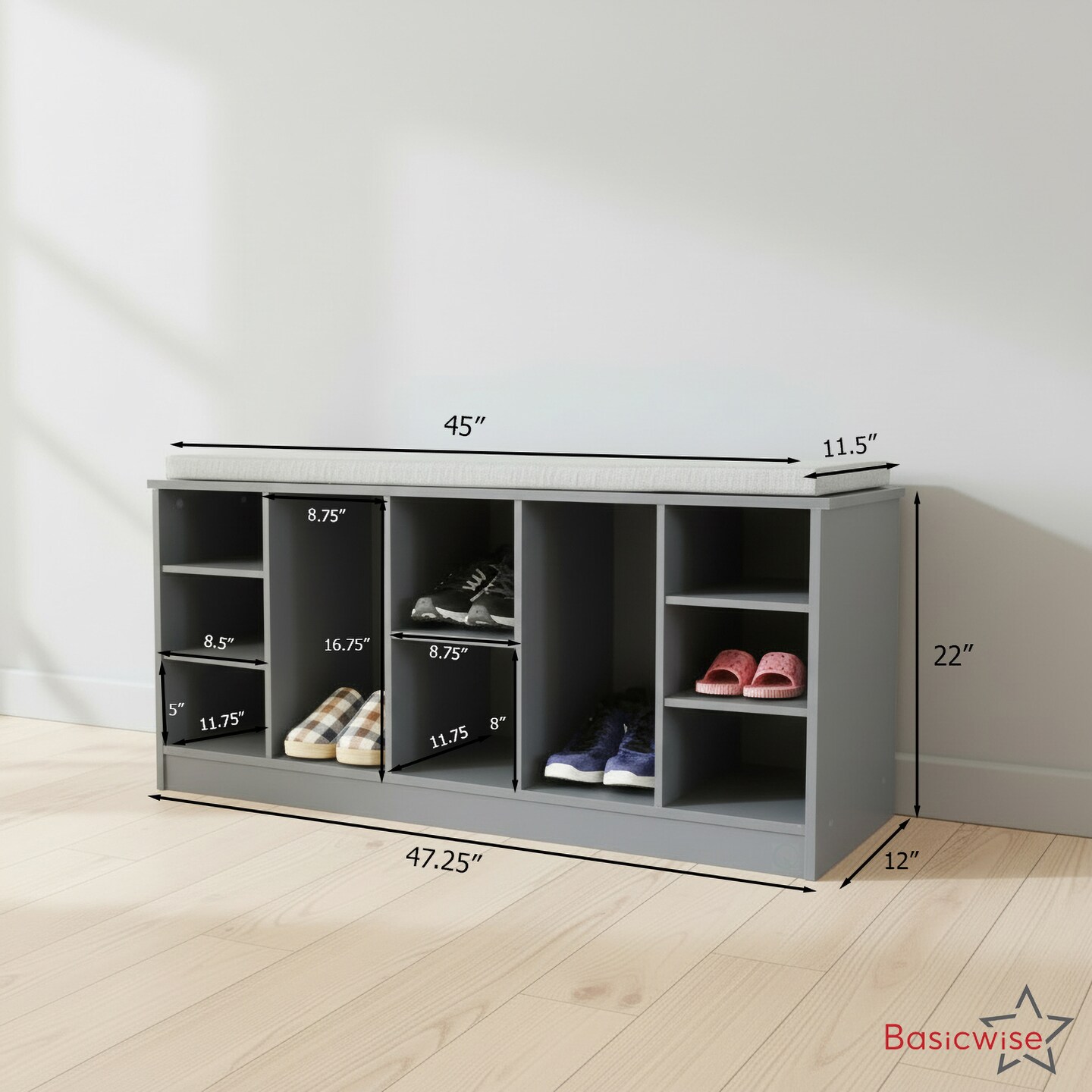 Basicwise Multi-Purpose Wooden Shoe Storage Bench Cushioned Seat Open Cubby Compartments and Versatile Organizer for Shoes Boots Sneakers and Accessories in Entryway Bedroom Mudroom or Living Room