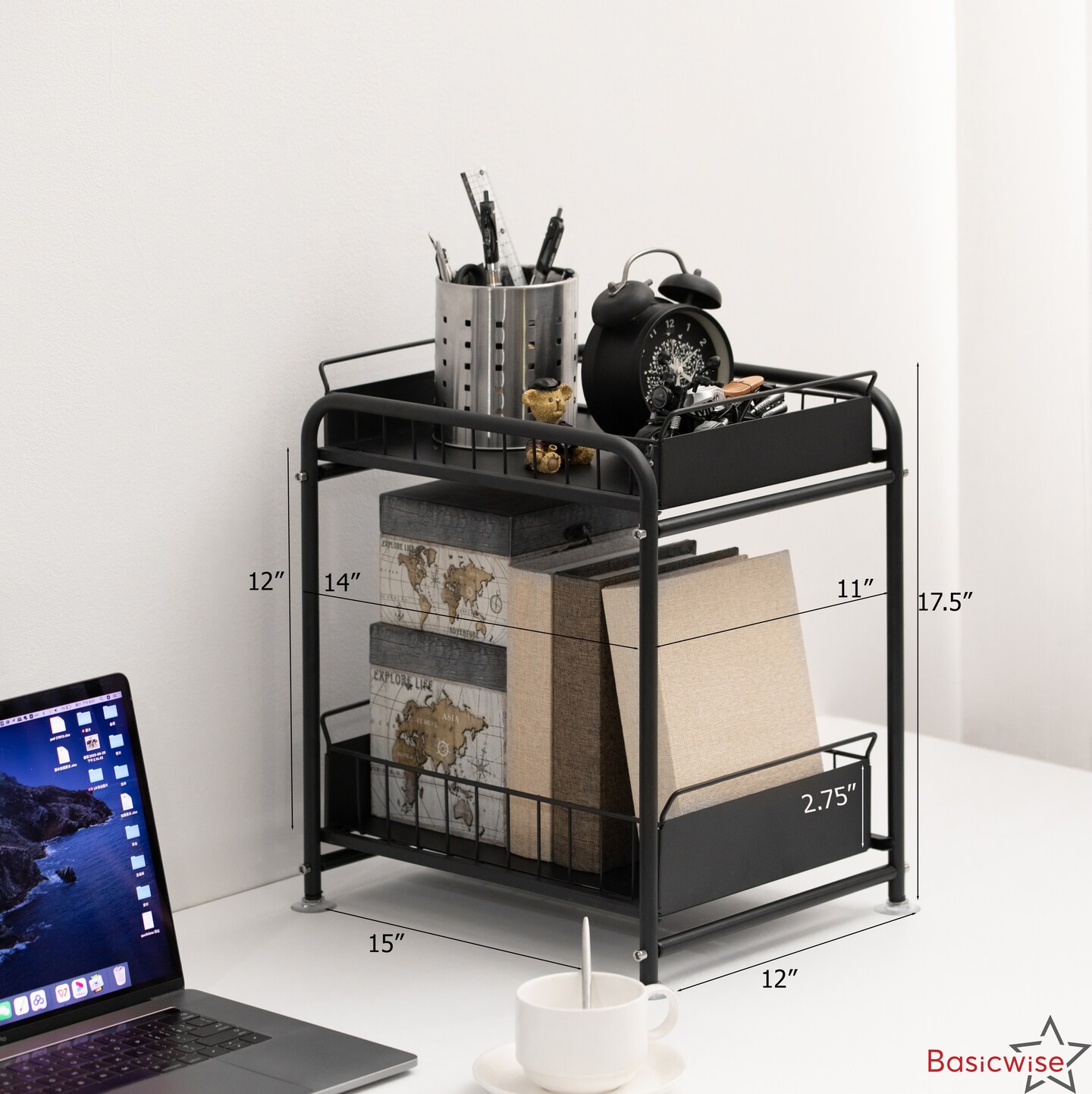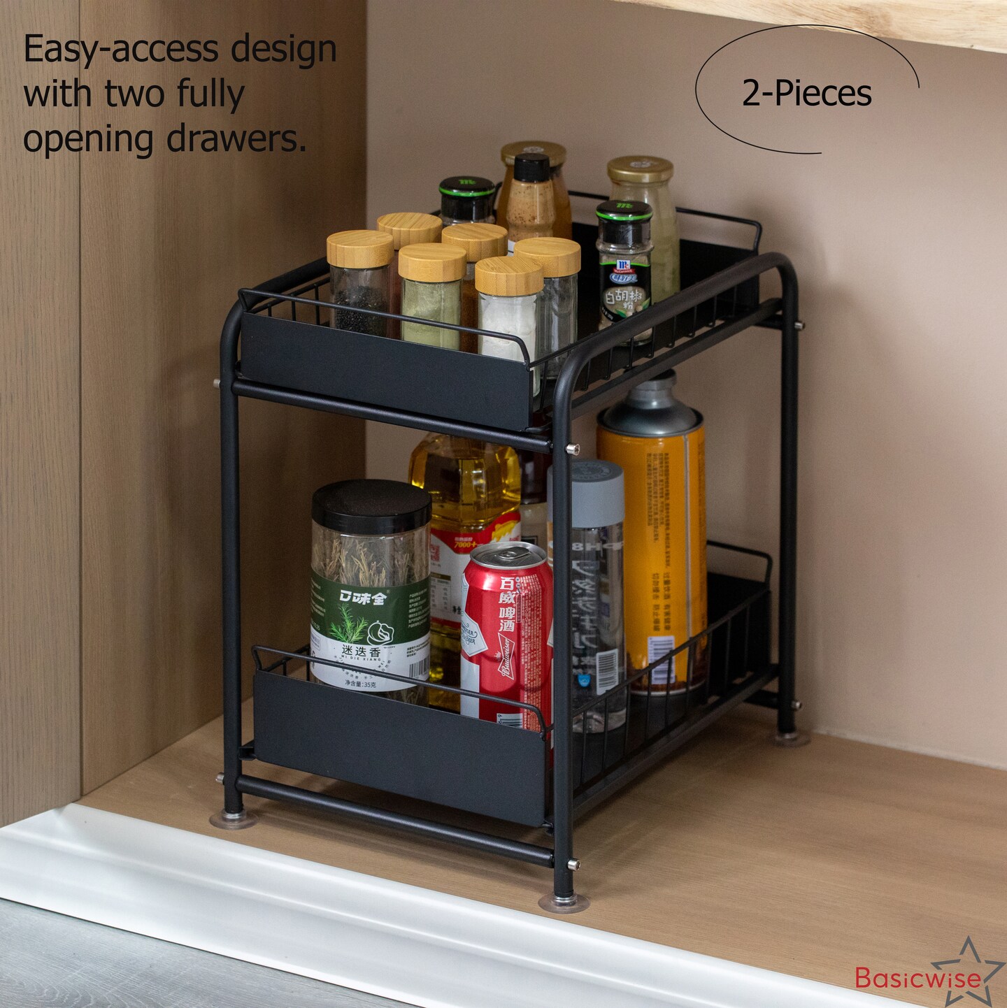 Basicwise Under Sink Organizer Sliding Wire Baskets Adjustable 2-Tier Metal Storage Rack for Bathroom Kitchen or Utility Cabinets Pull-Out Shelf for Toiletries Cleaning Supplies & Pantry Essentials