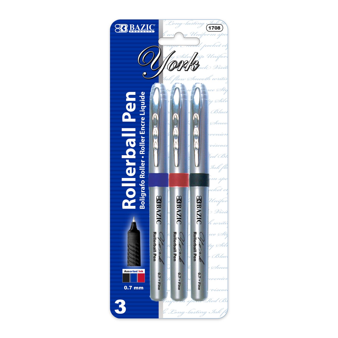 BAZIC York Assorted Color Rollerball Pen w/ Grip (3/Pack)