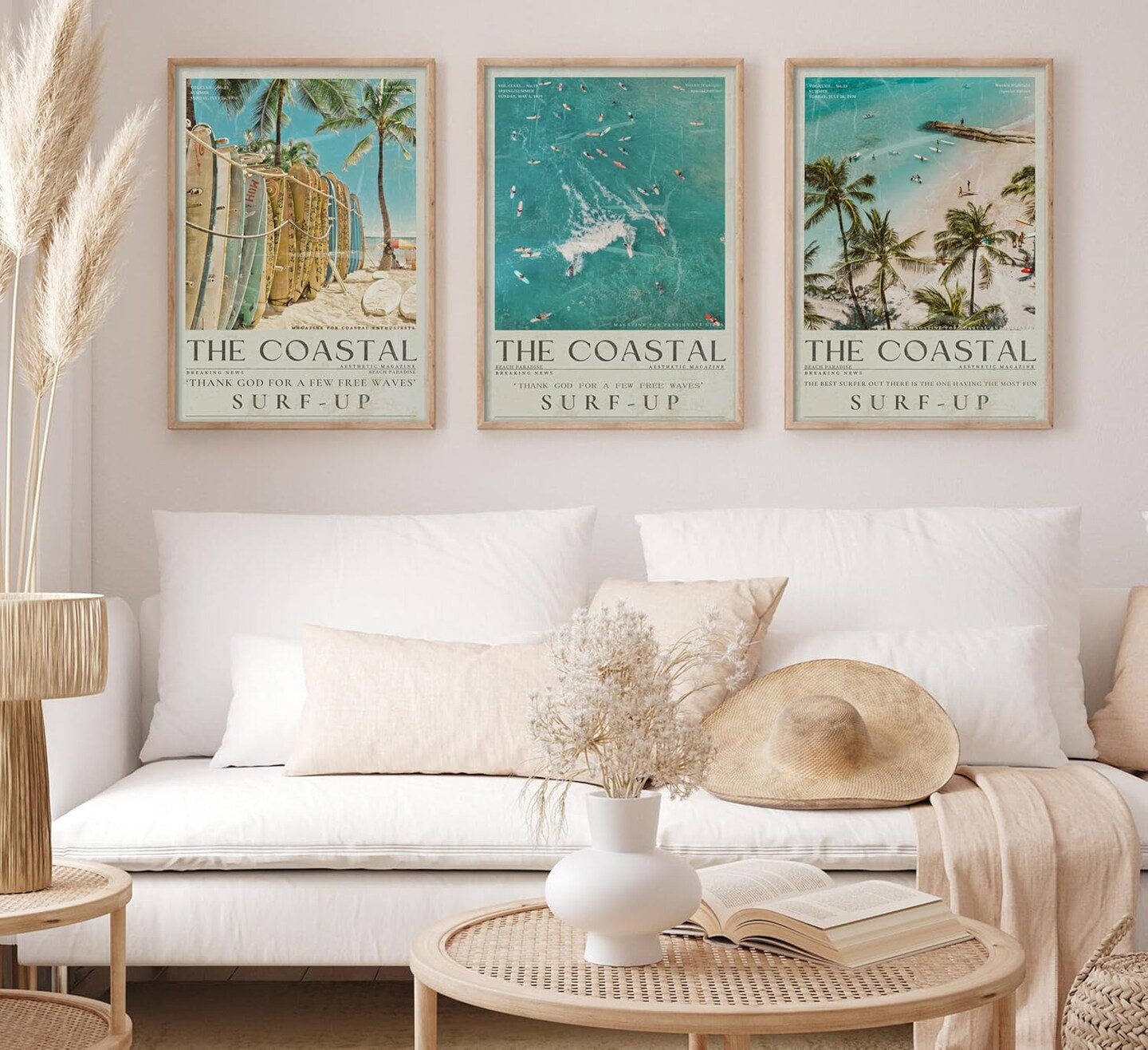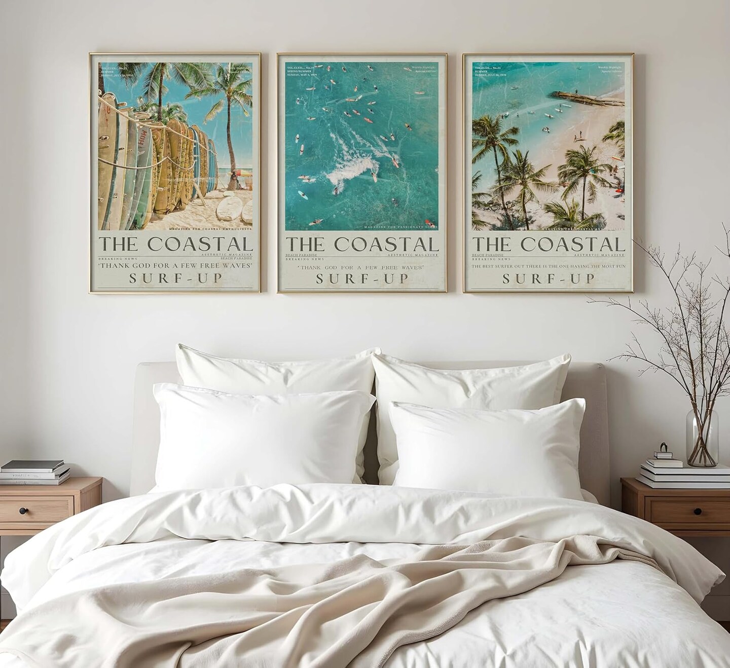Beach Surfing Canvas Wall Art Retro Newspaper Beaches Surfboard Painting Picture Wall Decor Summer Coastal Granddaughter Room Preppy Surf Up Poster Print Artwork for Dorm Bedroom Apartment Home Decor