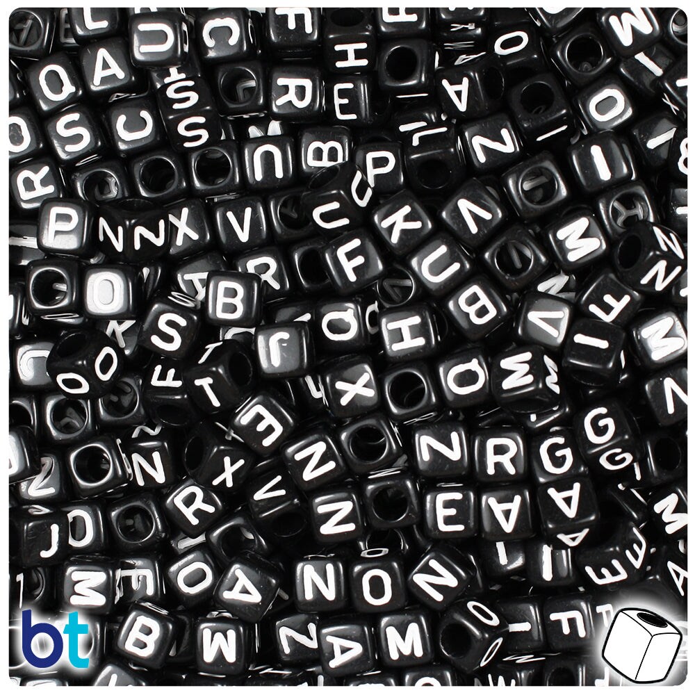 BeadTin Black Opaque 6mm Cube Plastic Alpha Beads - White Letter Mix (200pcs)