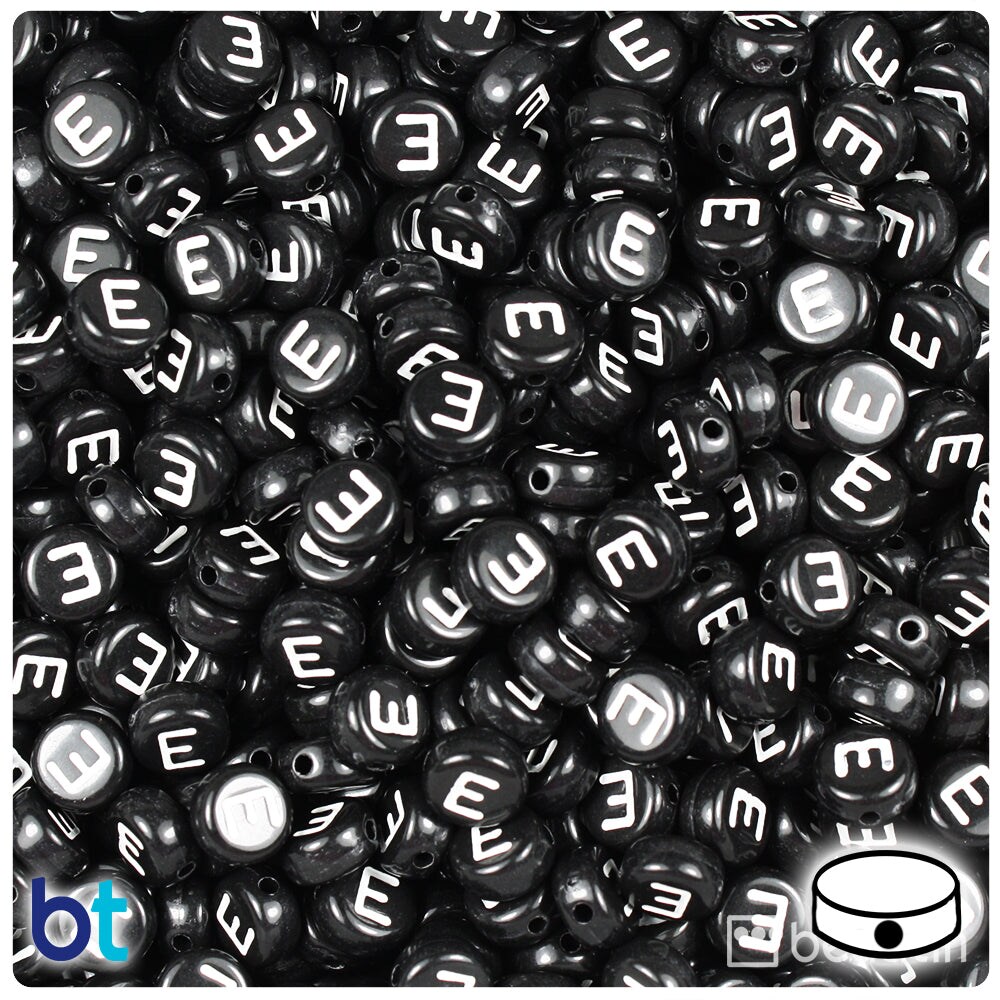 BeadTin Black Opaque 7mm Coin Plastic Alpha Beads - White Letter E (100pcs)