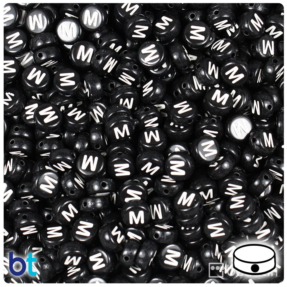 BeadTin Black Opaque 7mm Coin Plastic Alpha Beads - White Letter M (100pcs)
