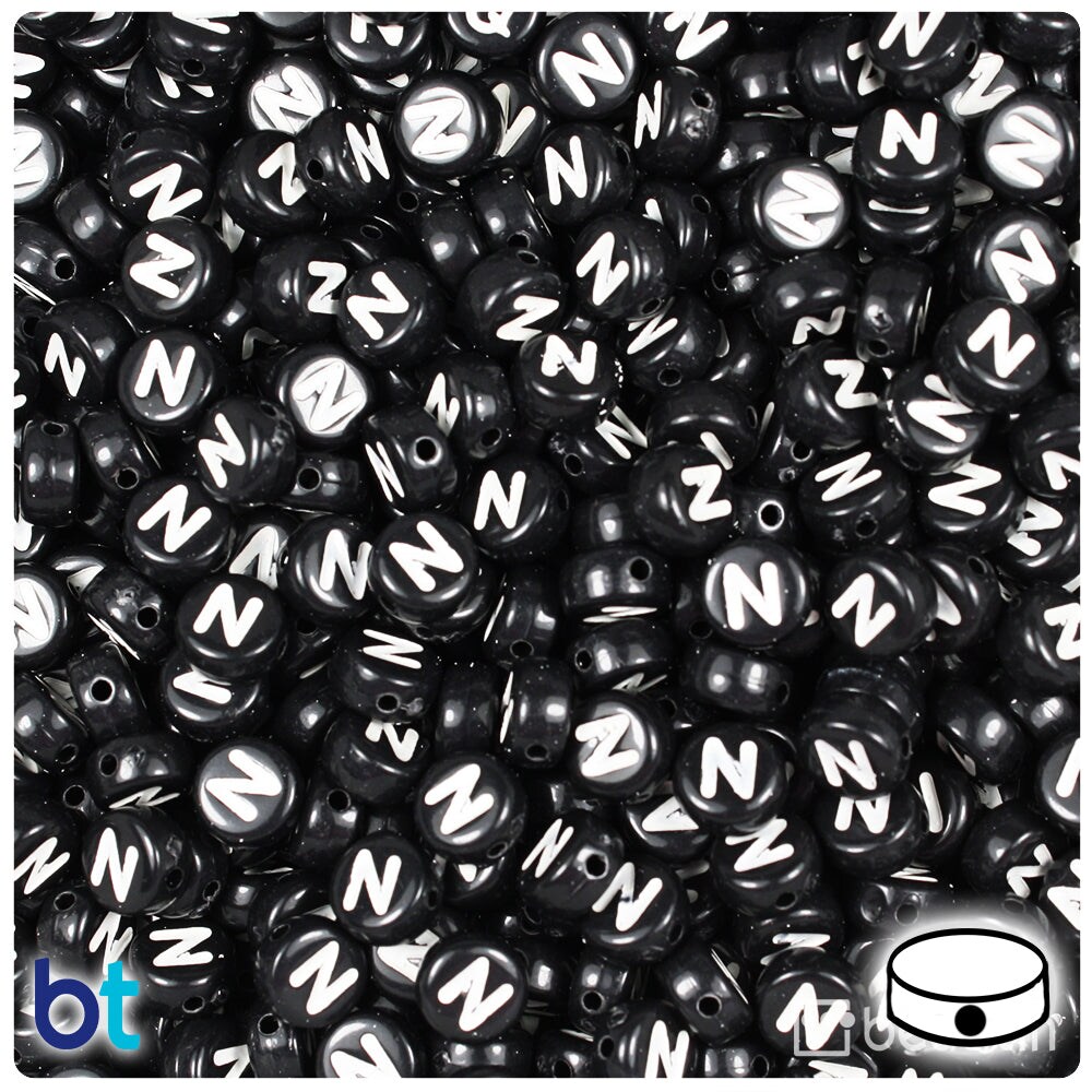 BeadTin Black Opaque 7mm Coin Plastic Alpha Beads - White Letter N (100pcs)
