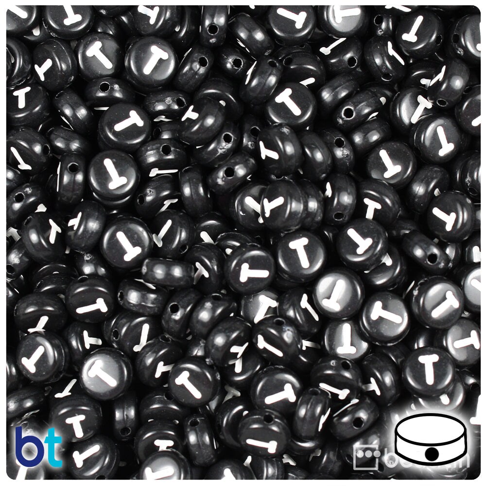 BeadTin Black Opaque 7mm Coin Plastic Alpha Beads - White Letter T (100pcs)