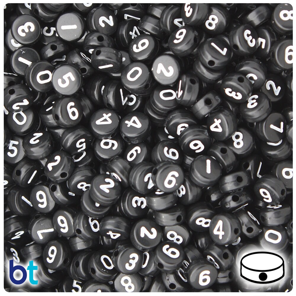 BeadTin Black Opaque 7mm Coin Plastic Alpha Beads - White Number Mix (250pcs)