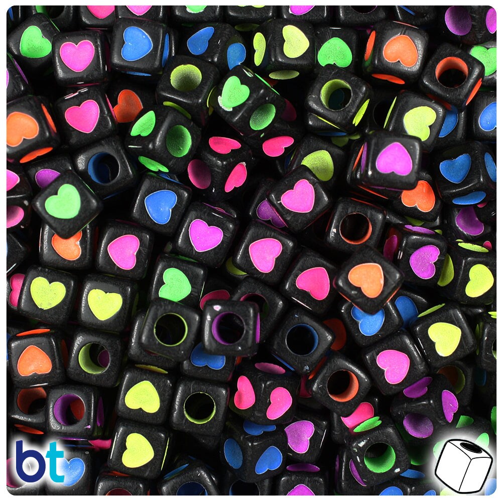 BeadTin Black Opaque 7mm Cube Plastic Alpha Beads - Colored Hearts (150pcs)