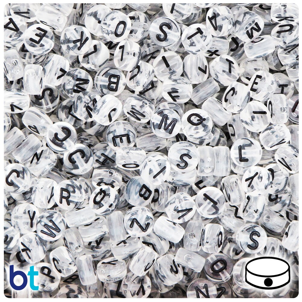 BeadTin Clear Transparent 7mm Coin Plastic Alpha Beads - Black Letter Mix (250pcs)