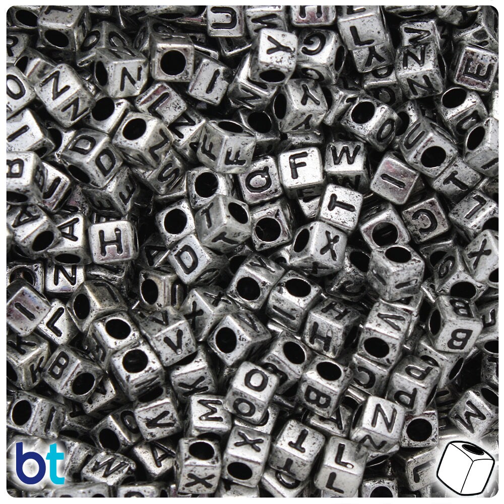 BeadTin Silver Metallic 6mm Cube Plastic Alpha Beads - Black Letter Mix (200pcs)
