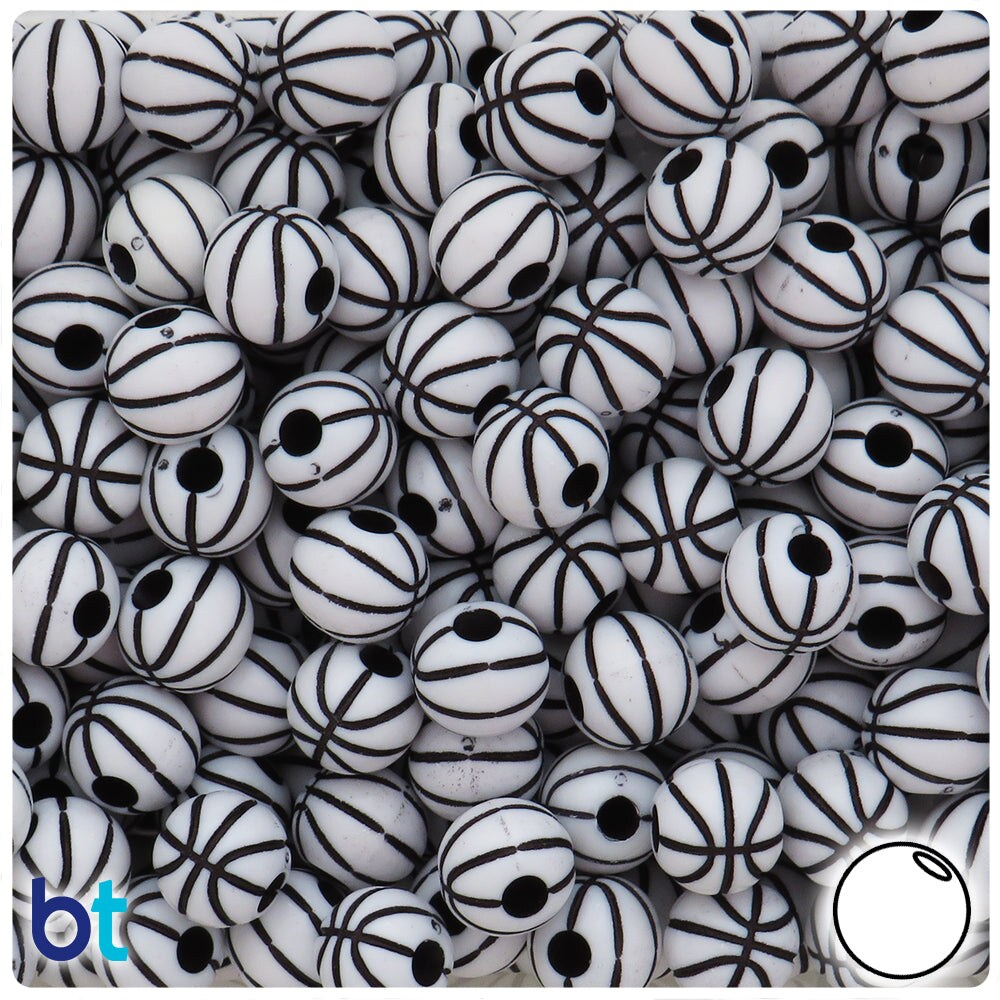 BeadTin White Opaque 12mm Round Plastic Pony Beads - Black Basketball Design (48pcs)