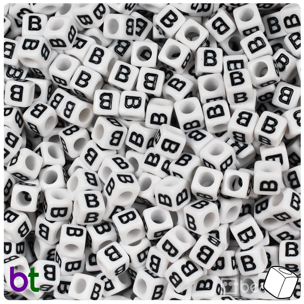 BeadTin White Opaque 6mm Cube Plastic Alpha Beads - Black Letter B (80pcs)