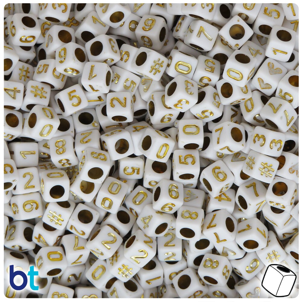 BeadTin White Opaque 6mm Cube Plastic Alpha Beads - Gold Number Mix (200pcs)