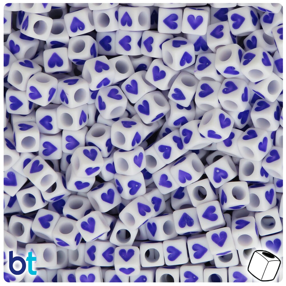BeadTin White Opaque 6mm Cube Plastic Alpha Beads - Purple Hearts (200pcs)