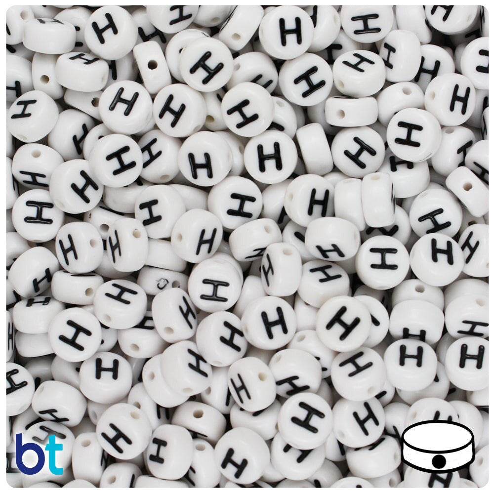 BeadTin White Opaque 7mm Coin Plastic Alpha Beads - Black Letter H (100pcs)