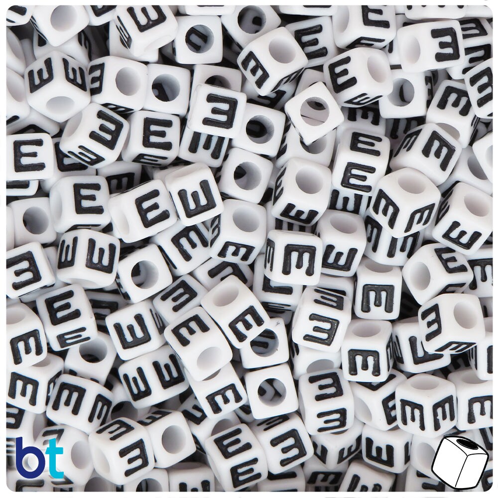 BeadTin White Opaque 7mm Cube Plastic Alpha Beads - Black Letter E (75pcs)