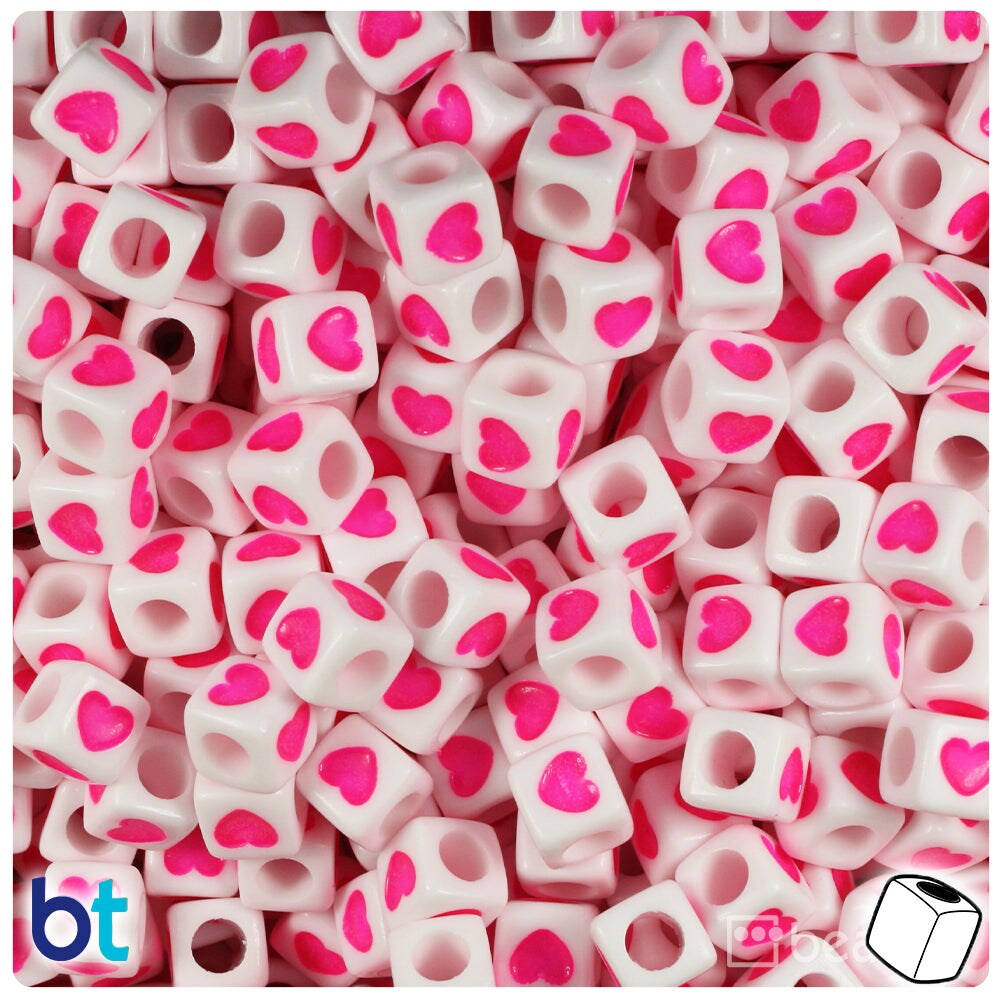 BeadTin White Opaque 7mm Cube Plastic Alpha Beads - Pink Hearts (150pcs)