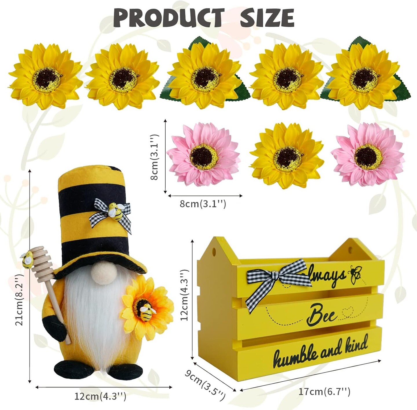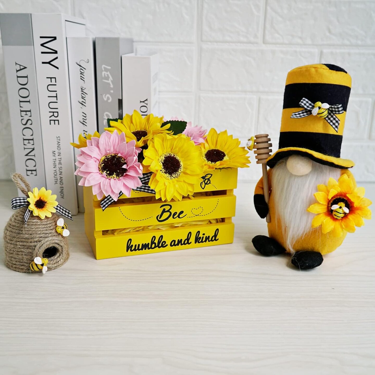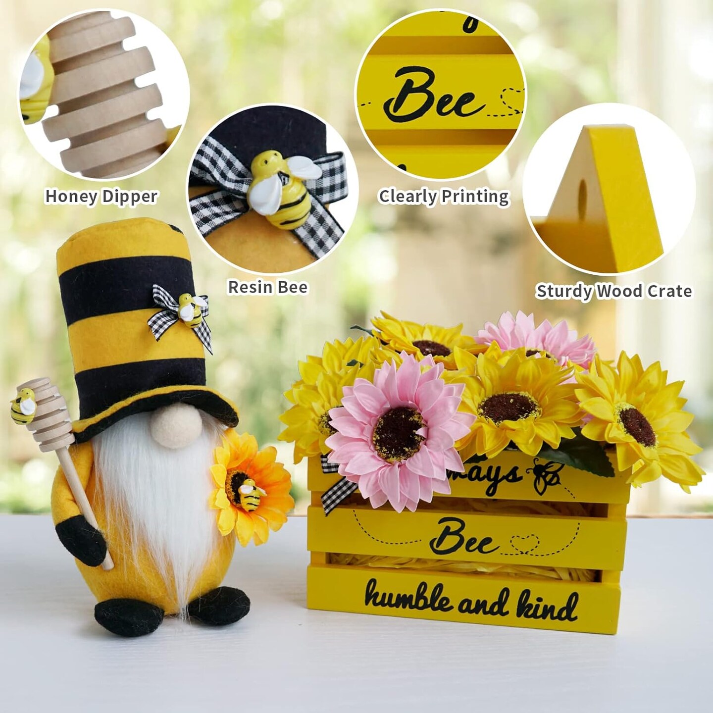 Bee-Themed Farmhouse Decor Set – Gnome Plush, Wood Crates & Sunflower Accents for Summer Home