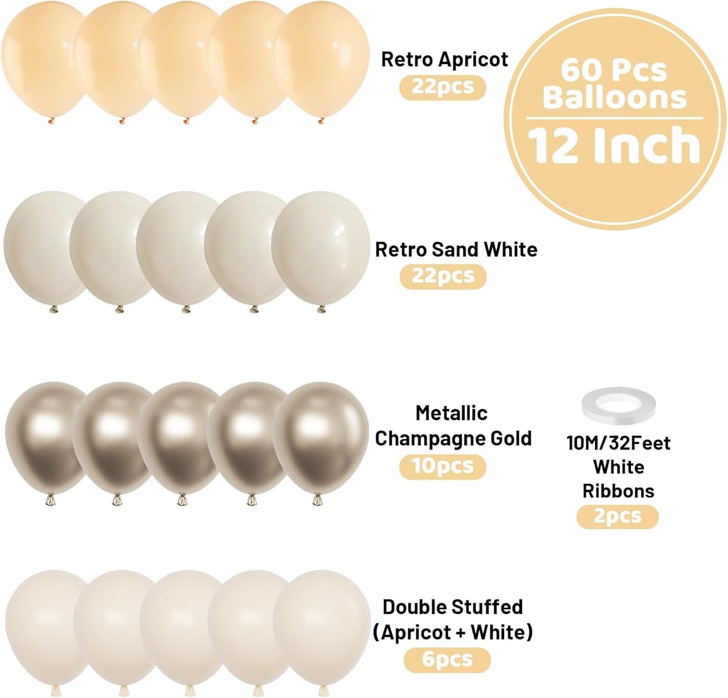 Beige Balloon Set, 60PCS Nude Birthday Balloons, 12Inch Sand White Apricot Double Stuffed Balloon Neutral Champagne Gold Balloons for Birthday Baby Shower Wedding Boho Bride Party Decorations