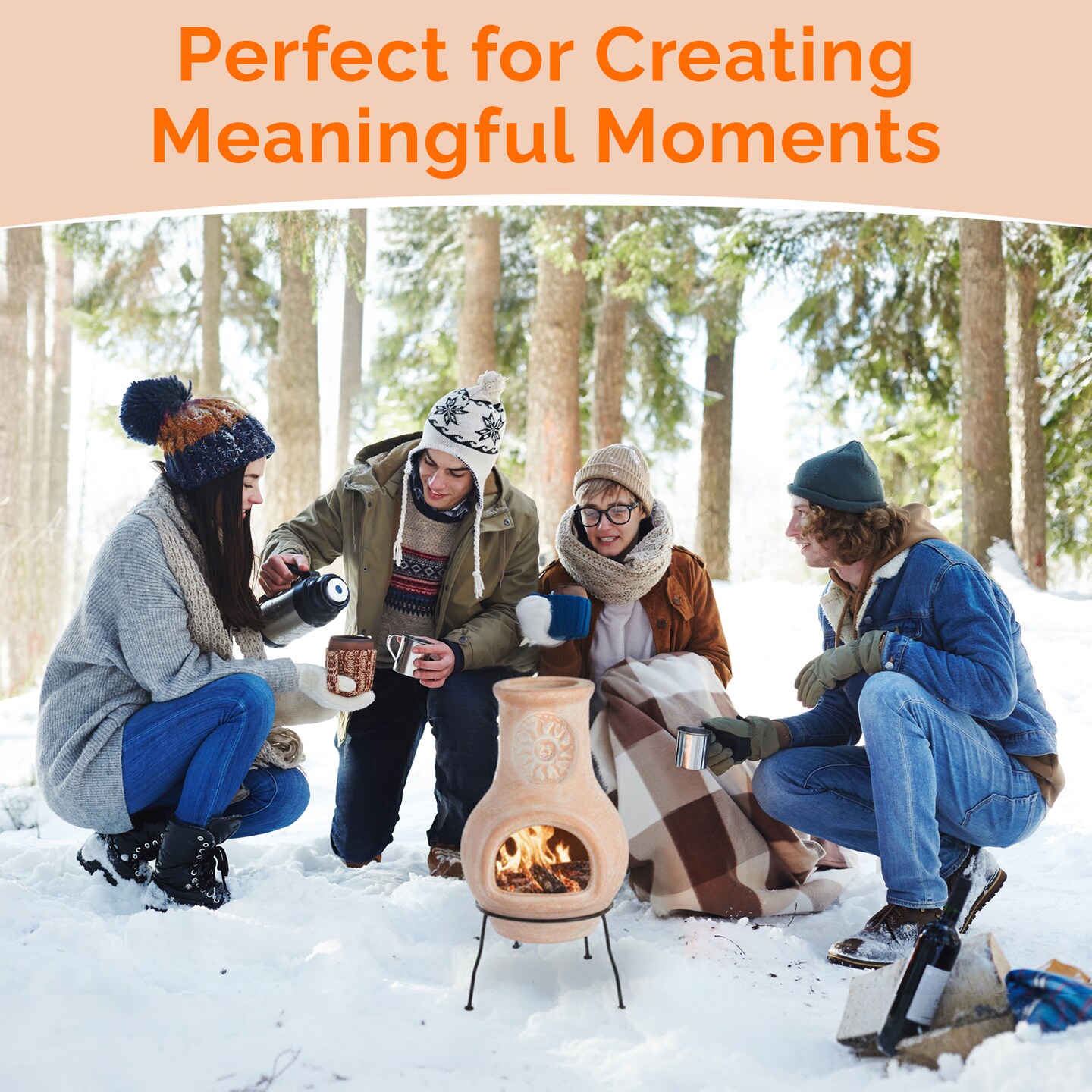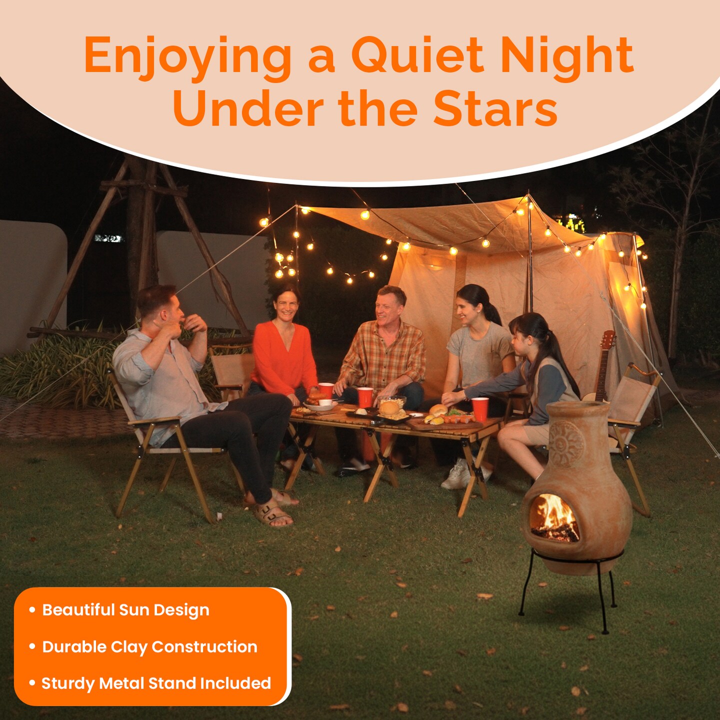 Beige Outdoor Clay Ciminea Outdoor Fireplace Sun Design Charcoal Burning Fire Pit with Sturdy Metal Stand, Barbecue, Cocktail Party, Family Gathering, Cozy Nights Fire Pit