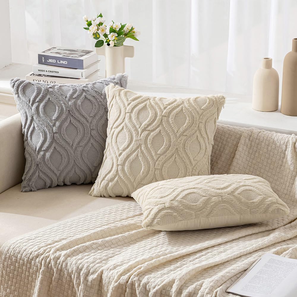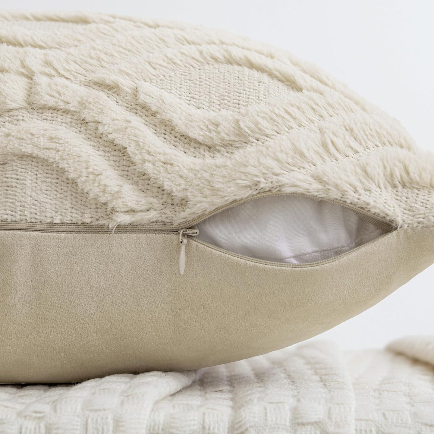 Beige Throw Pillow Covers 18x18 Inch, Soft Winter Plush Faux Wool Couch Pillow Covers Set of 2 Decorative Farmhouse Boho Throw Pillows for Sofa Living Room Bed