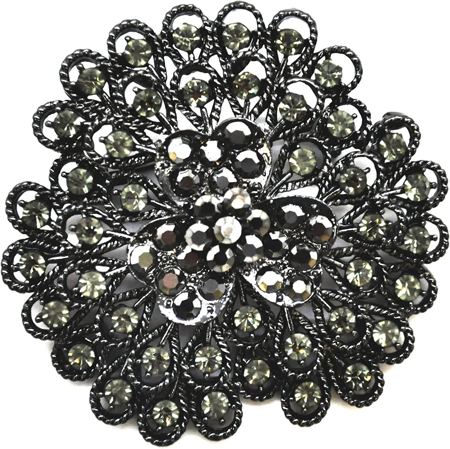 Belagio Rhinestone Brooch, 2.5" Diameter, 1 Piece, Peacock Fan, Black/Metal Gray