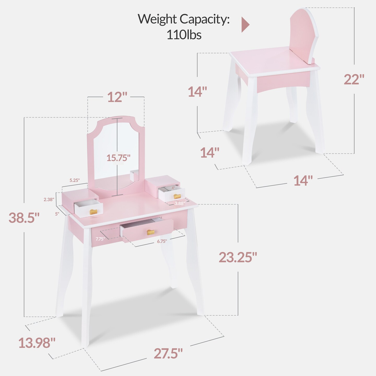 Best Choice Kids Wooden Pretend Play Vanity and Chair Set w/ Mirror – Little Girls Makeup Table with 3 Drawers