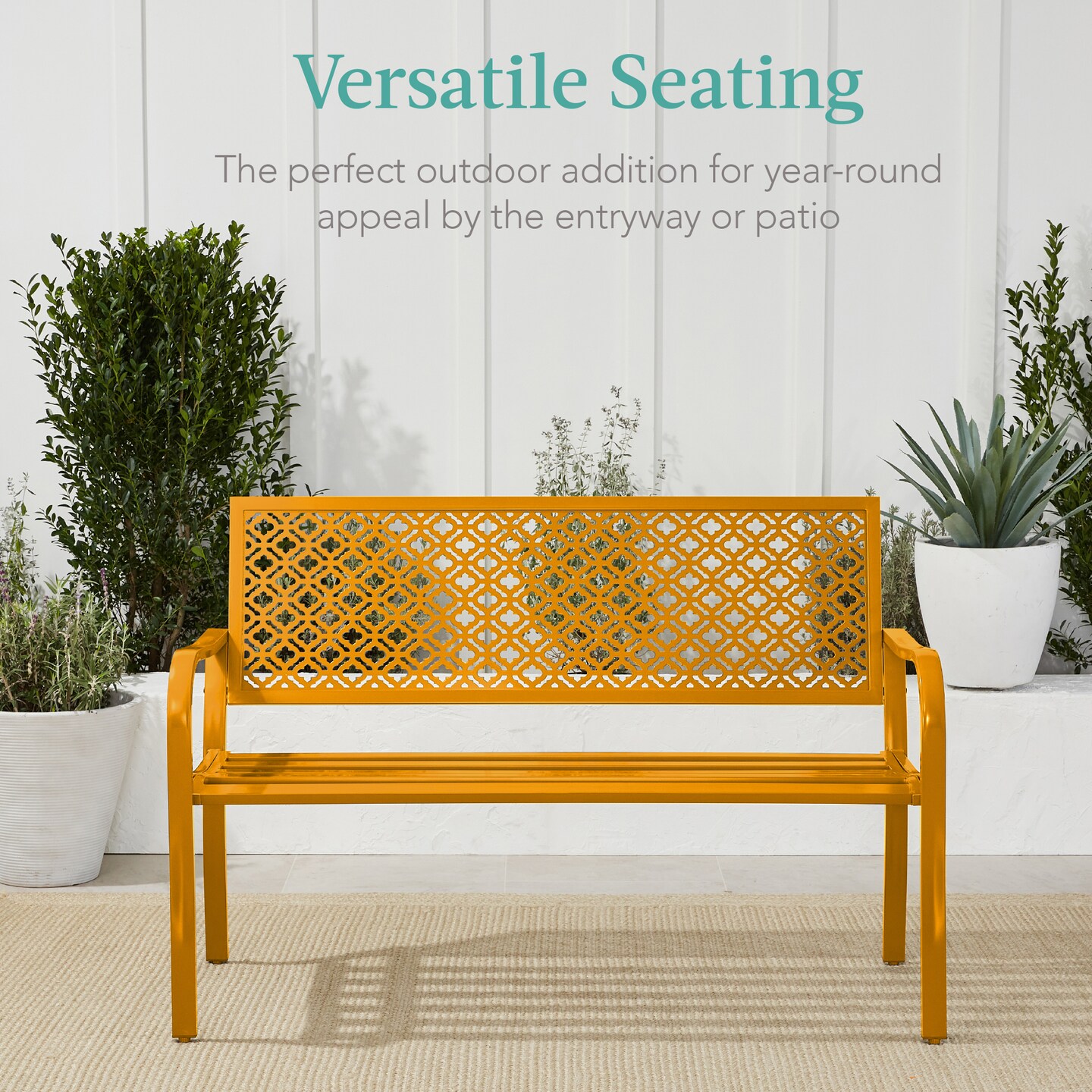 Best Choice Products Indoor Outdoor Steel Garden Bench w/ Geometric Backrest, Foot Levelers