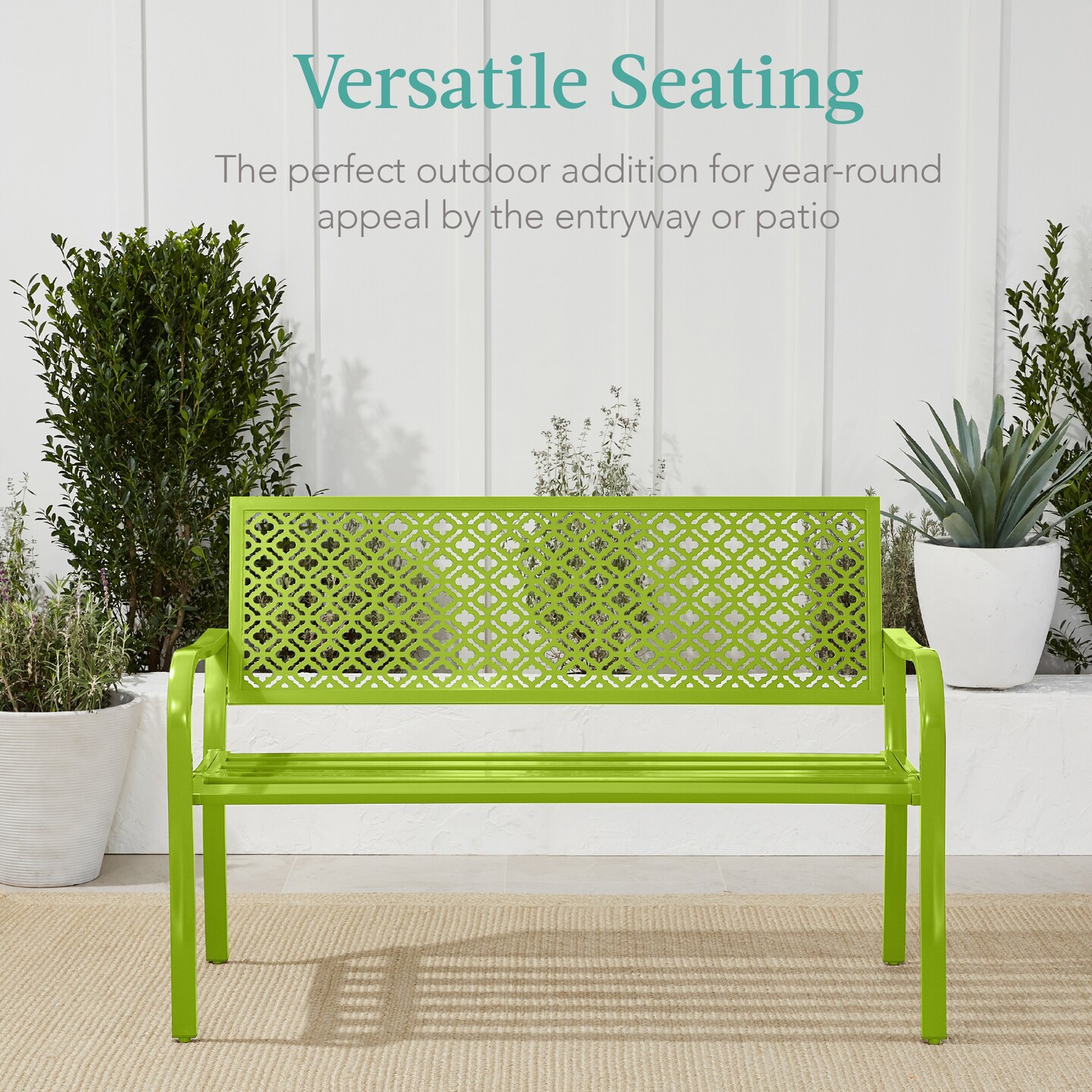 Best Choice Products Indoor Outdoor Steel Garden Bench w/ Geometric Backrest, Foot Levelers