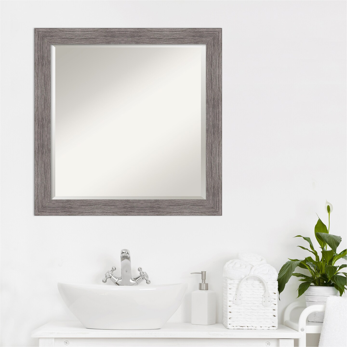 Beveled Bathroom Wall Mirror, Pinstripe Plank Grey Narrow Frame
