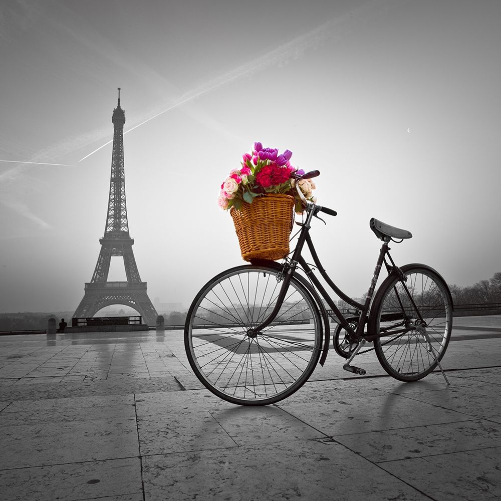 Bicycle with a basket of flowers next to the Eiffel tower Poster Print by Assaf Frank # AF201203161105C09