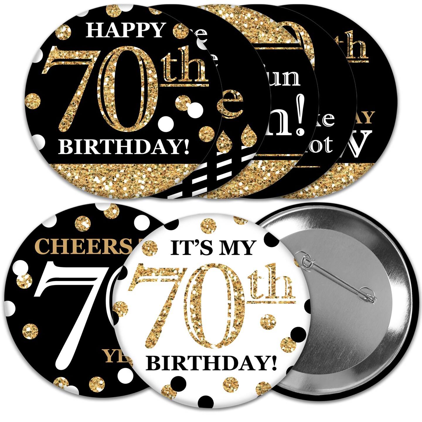 Big Dot of Happiness Adult 70th Birthday - Gold - 3 inch Birthday Party Badge - Pinback Buttons - Set of 8