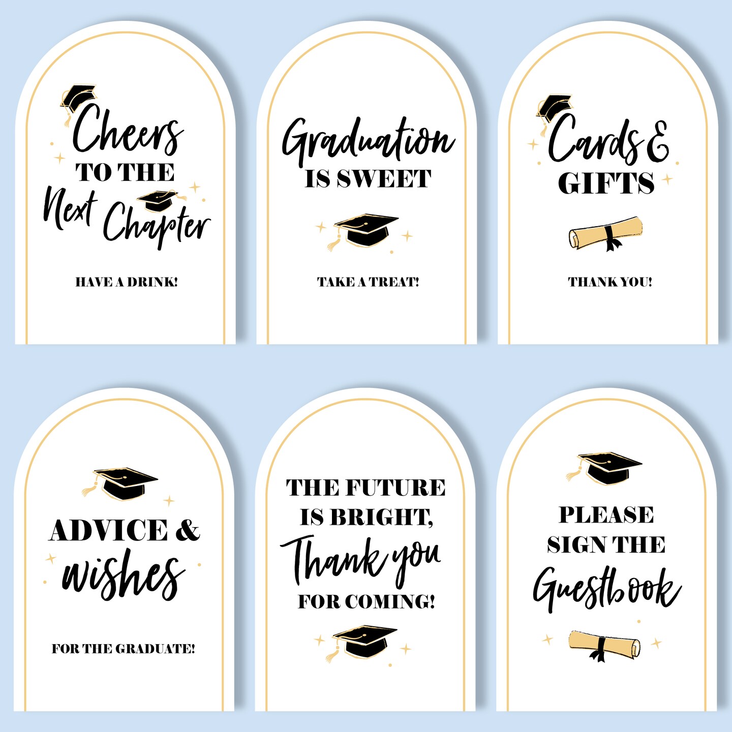 Big Dot of Happiness Black & Gold Graduation Party Signs with Stand Set, Table Sign Bundle Food, Drinks, Cards Gifts, Guestbook, Advice, Favors, 6 Ct