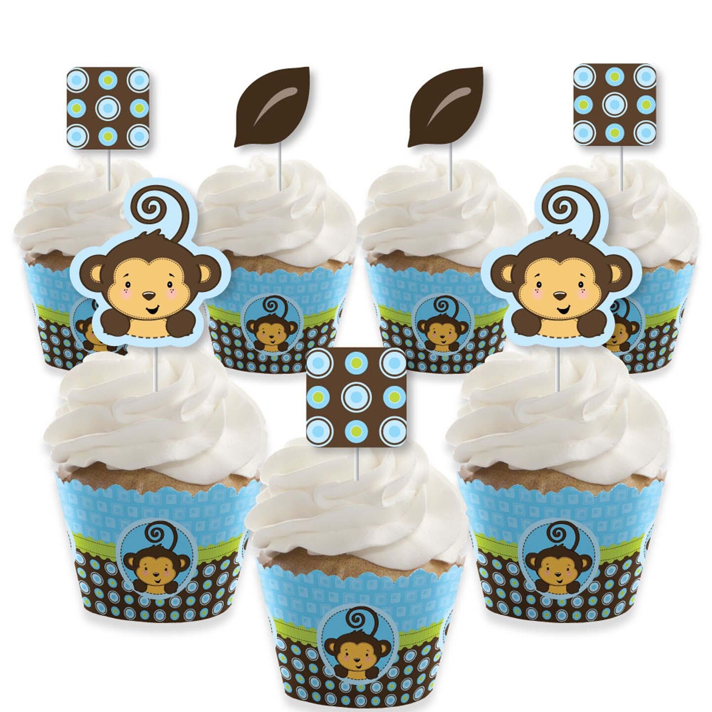 Big Dot of Happiness Blue Monkey Boy - Cupcake Decoration - Baby Shower or Birthday Party Cupcake Wrappers and Treat Picks Kit - Set of 24