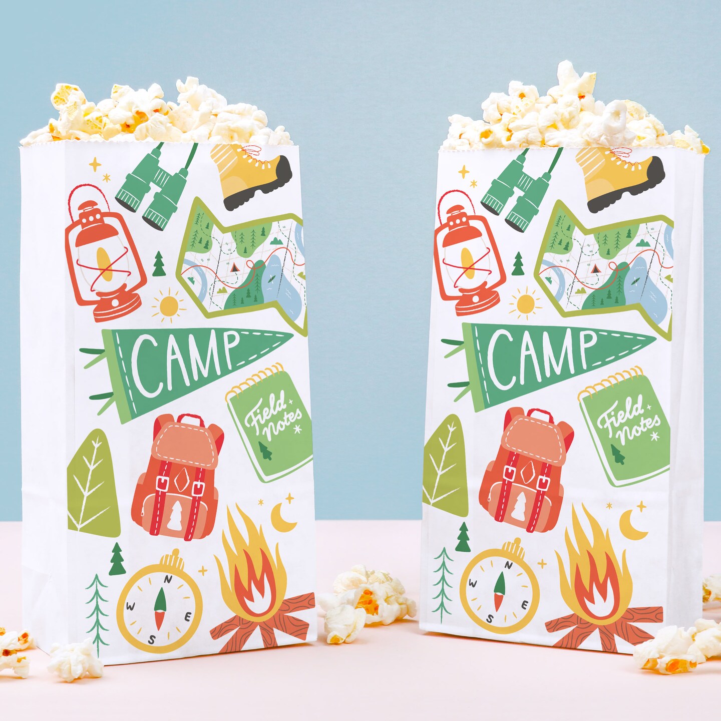 Big Dot of Happiness Camping Popcorn Bags, Happy Camper Kids Birthday Party Favor Snack Treats, Free-Standing Individual White Paper Bags - 25 Ct