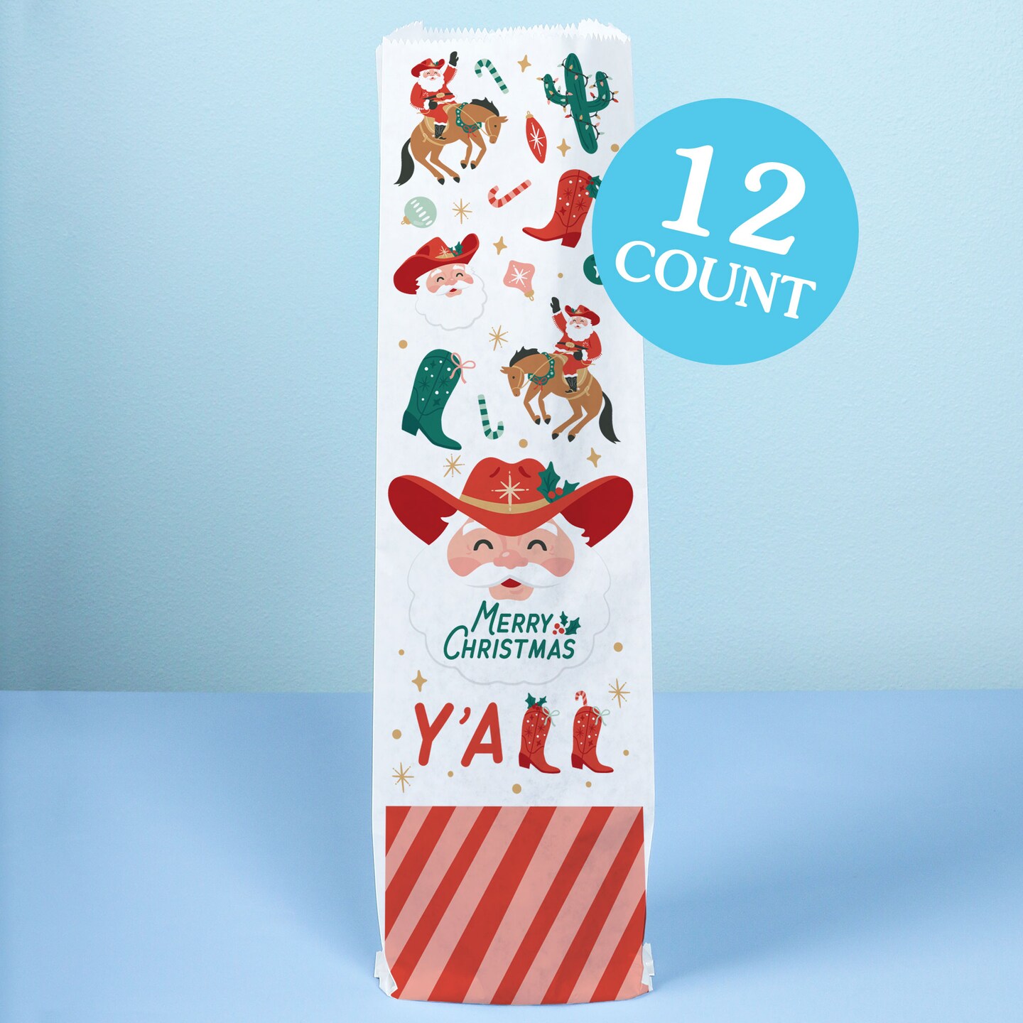 Big Dot of Happiness Christmas Cowboy Wine Gift Bags, Funny Western Santa Hostess Thank You Wine Bottle Gift Wrap, Bulk Holiday Paper Bags - 12 ct