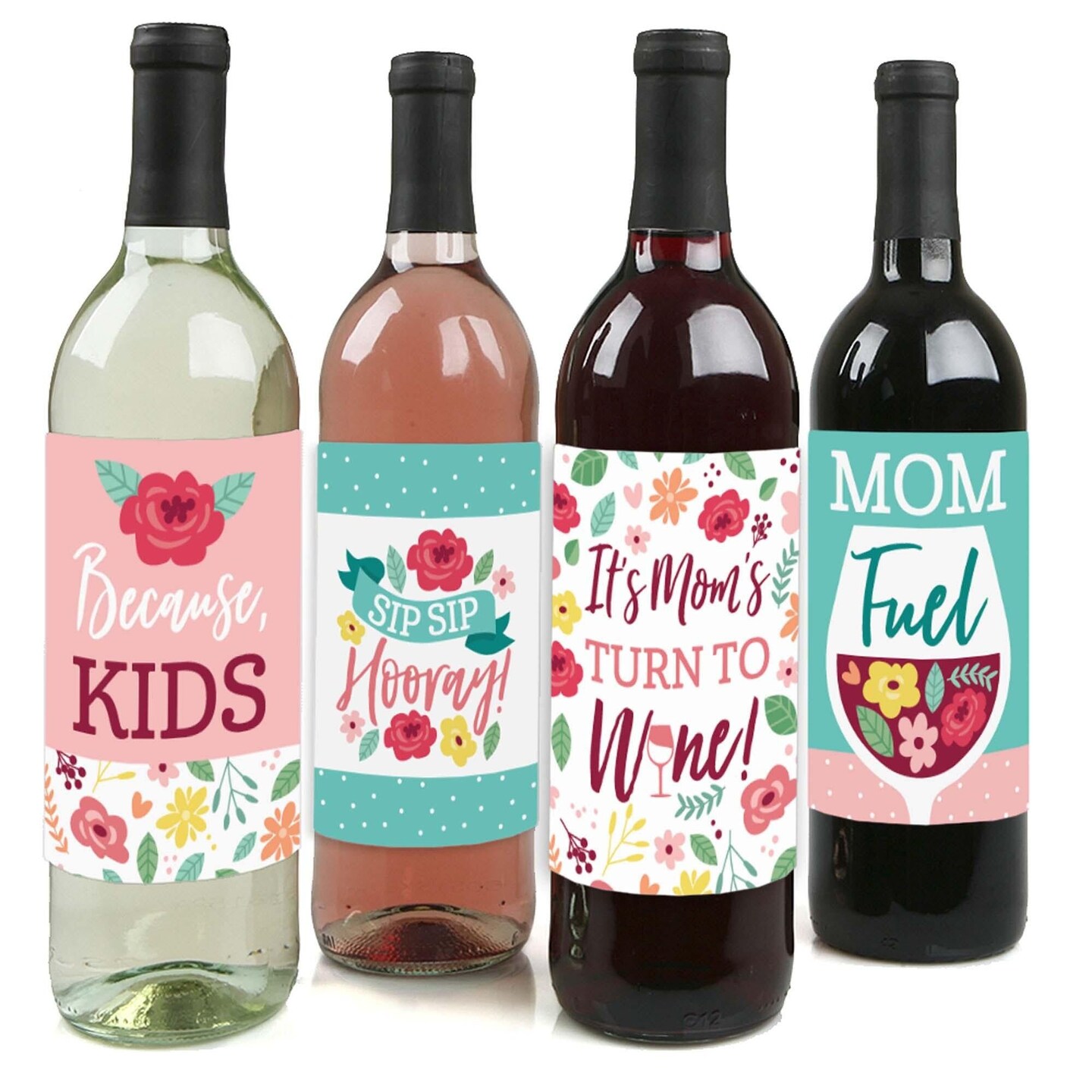 Big Dot of Happiness Colorful Floral Happy Mother's Day - We Love Mom Party Decorations for Women - Wine Bottle Label Stickers - Set of 4