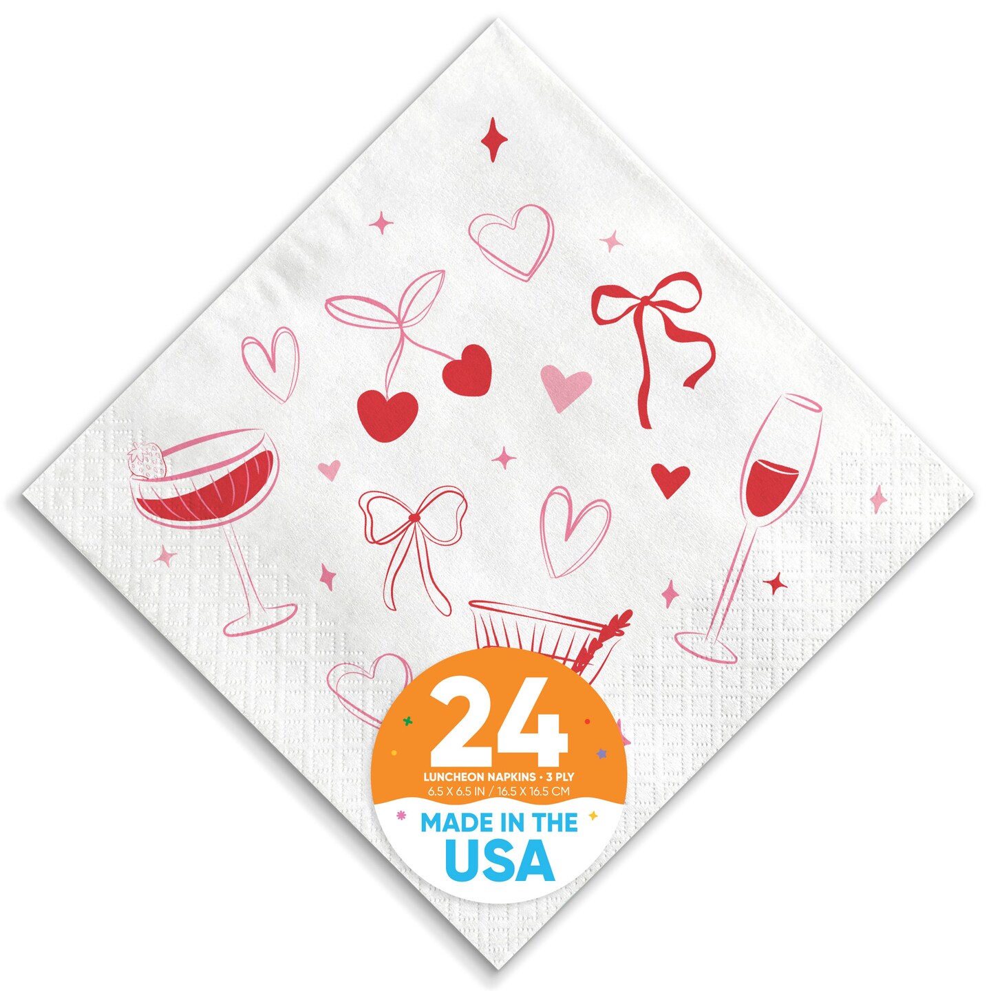 Big Dot of Happiness Drinks with the Girls Napkins, Galentine's Day or Bows, Hearts, Cherries Birthday, White 3-Ply Paper Luncheon Napkins - 24 Count