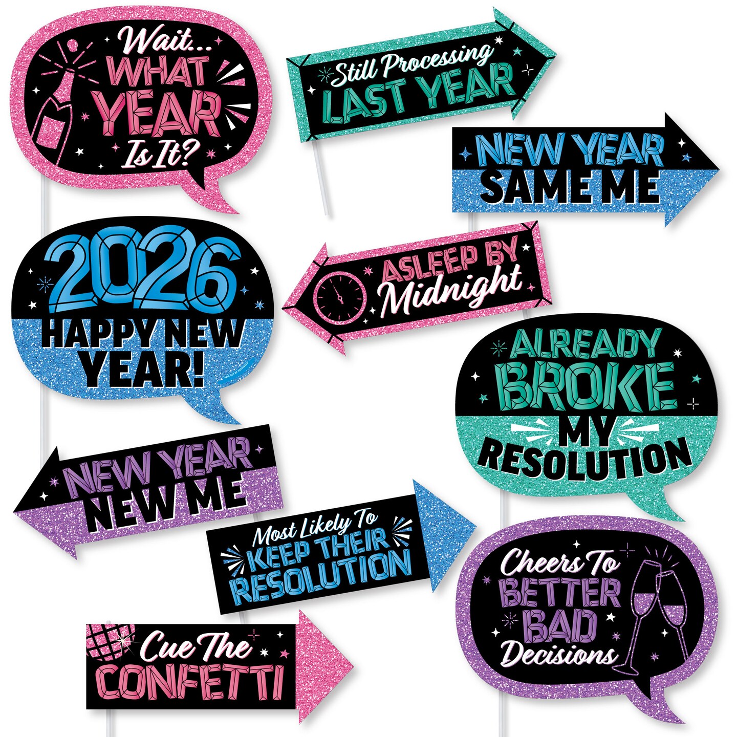 Big Dot of Happiness Funny Colorful New Year Photo Props, 2026 New Year's Eve Party Decor, NYE Midnight Photo Booth Props Kit – 10 Count Selfie Sticks