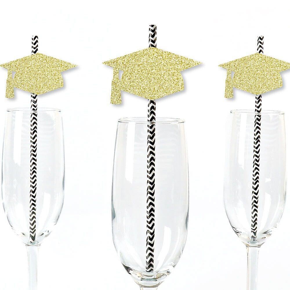 Big Dot of Happiness Gold Glitter Grad Cap Party Straws - No-Mess Real Gold Glitter Cut-Outs & Decorative Graduation Party Paper Straws - Set of 24