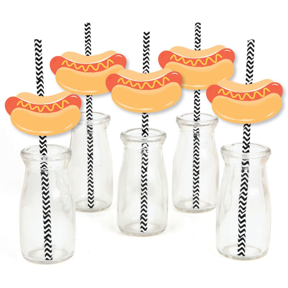 Big Dot of Happiness Hot Dog Straw Decor, Summer Birthday BBQ Picnic Party Supplies, Set of Hot Dog Cutouts & Striped Decorative Paper Straws - 24 Ct