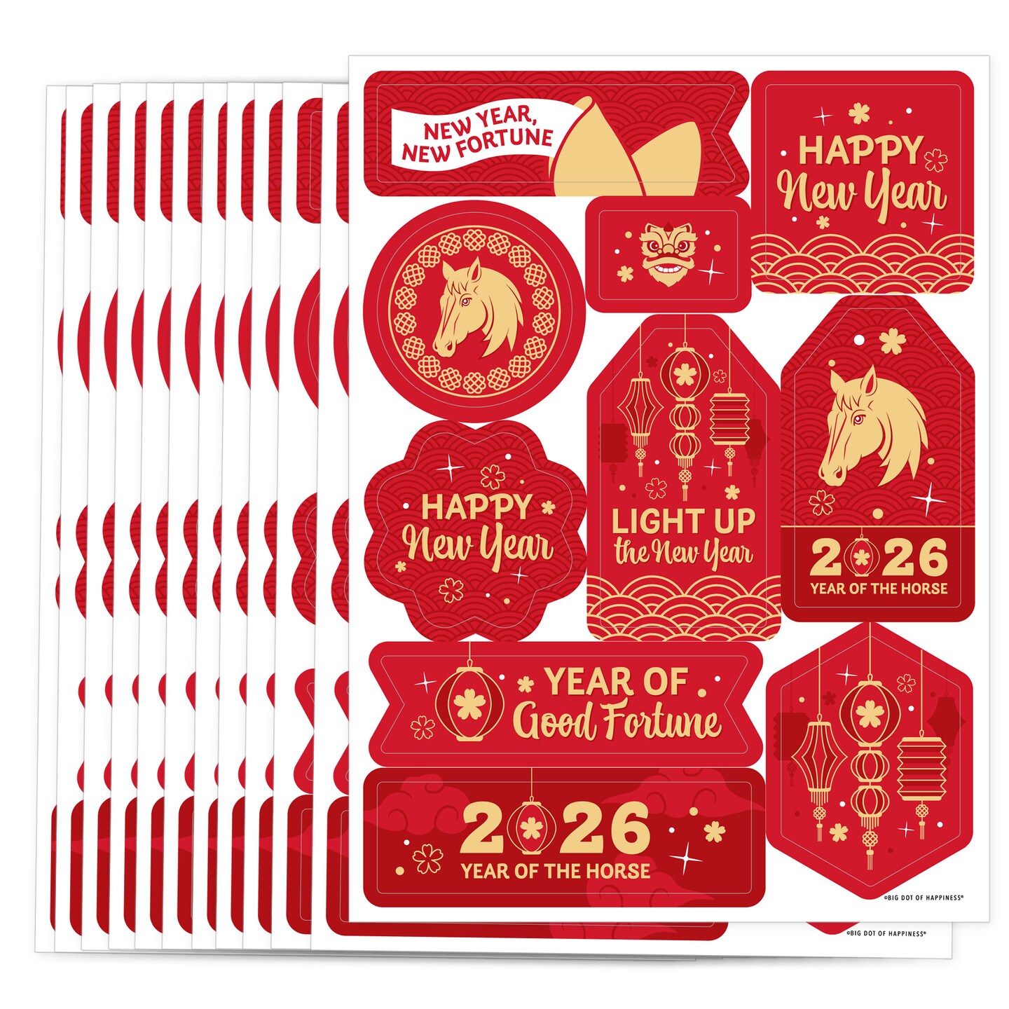 Big Dot of Happiness Lunar New Year - 2026 Year of the Horse Party Favor Sticker Set - 12 Sheets - 120 Stickers