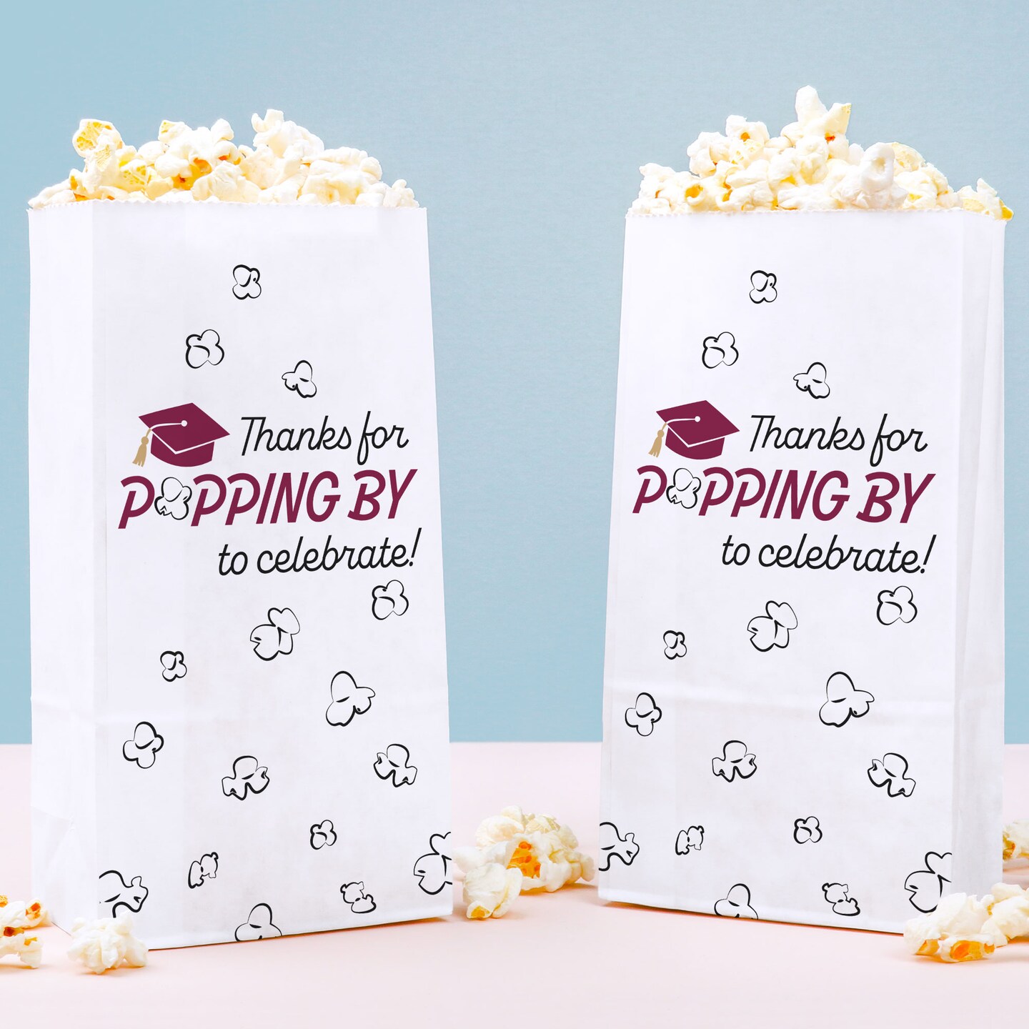 Big Dot of Happiness Maroon Grad Thanks for Popping by Popcorn Bags, Burgundy Graduation Favor, Free-Standing Individual White Paper Bags - 25 Count