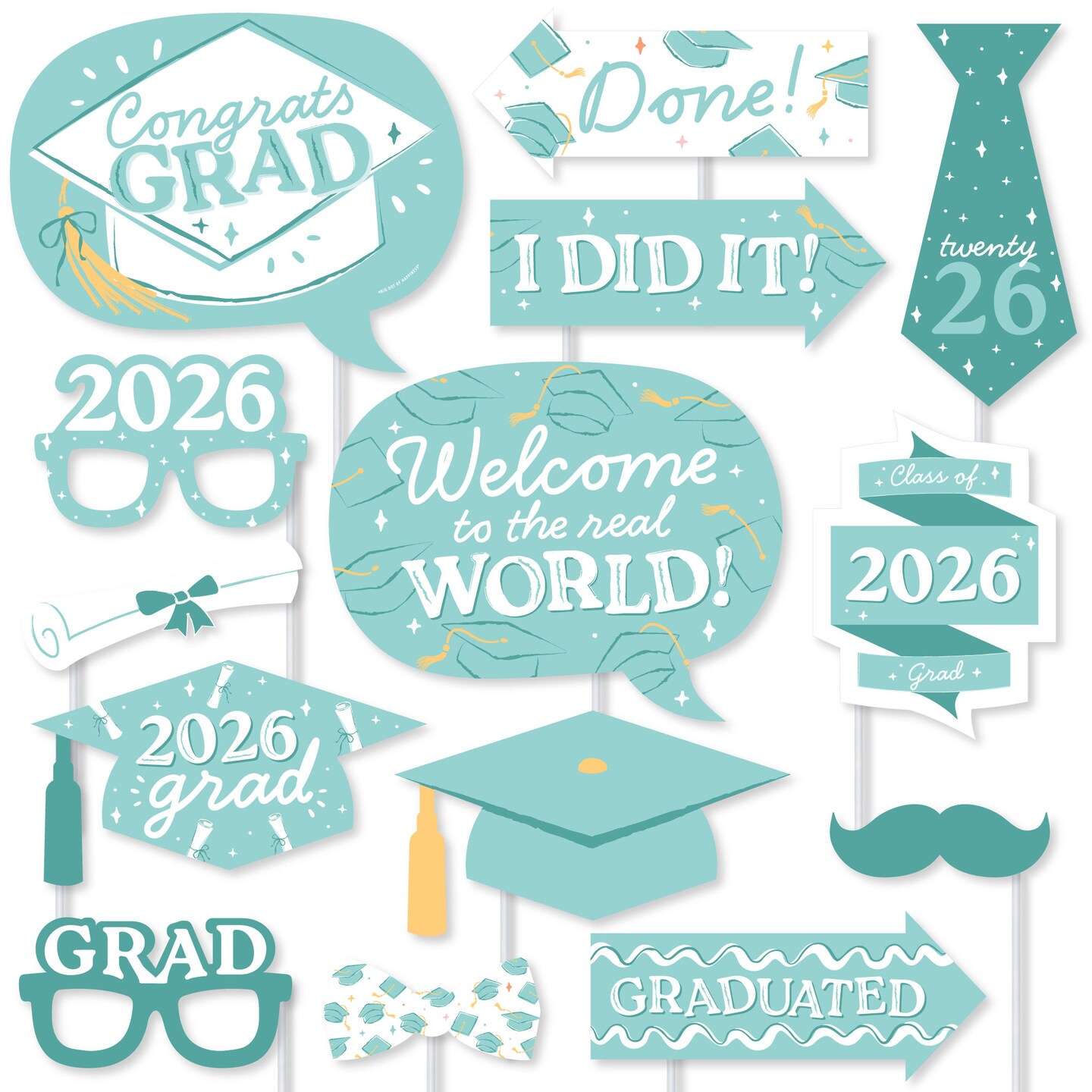 Big Dot of Happiness Mint Green Graduation Props for Photoshoot 2026, Set of Photo Booth Props for Pictures and Graduation Party Decorations - 20 Ct
