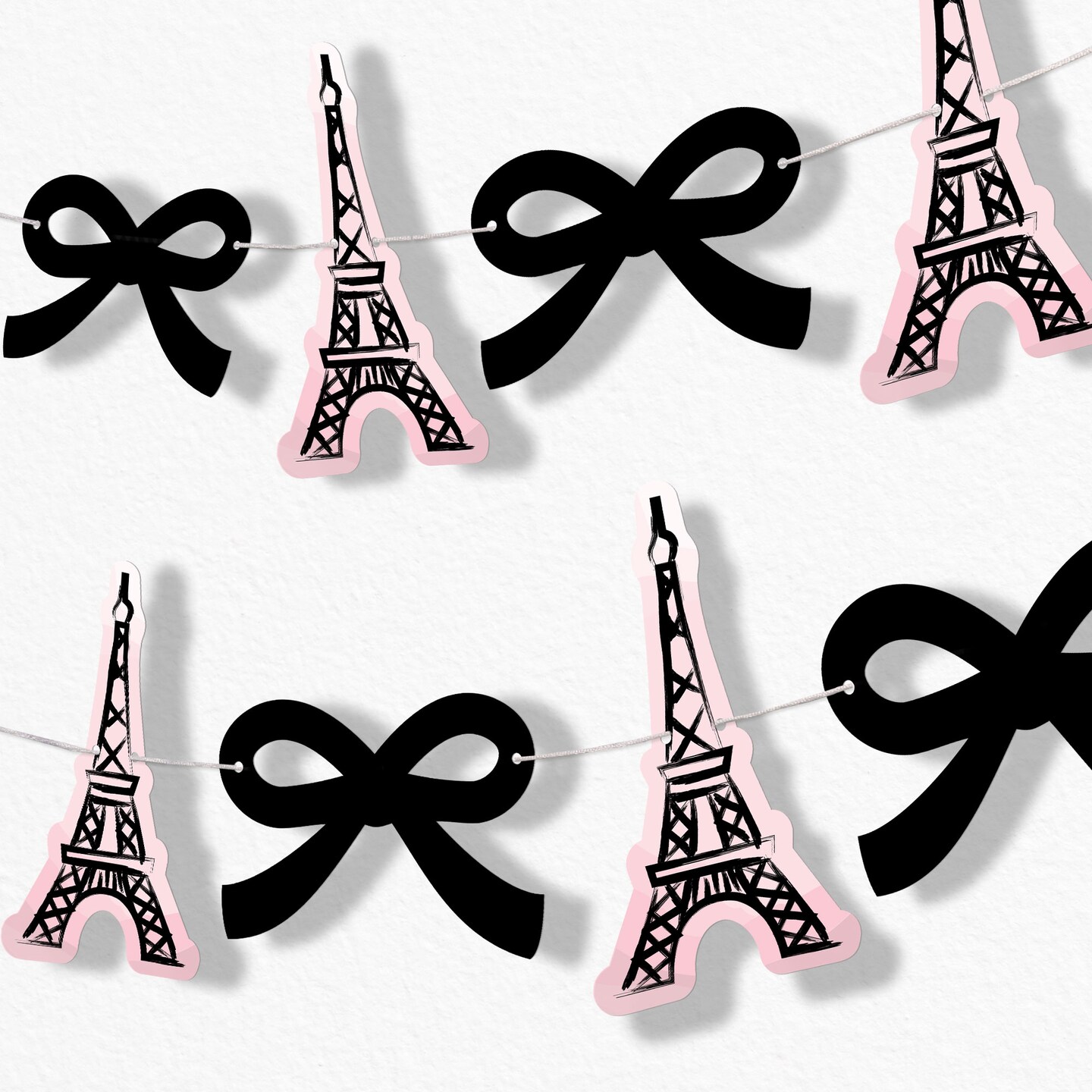 Big Dot of Happiness Paris Garland Banner, Paris Themed Baby Shower or Chic Birthday Backdrop, 30 Feet of Cord, 15 Double-Sided Eiffel Towers & Bows