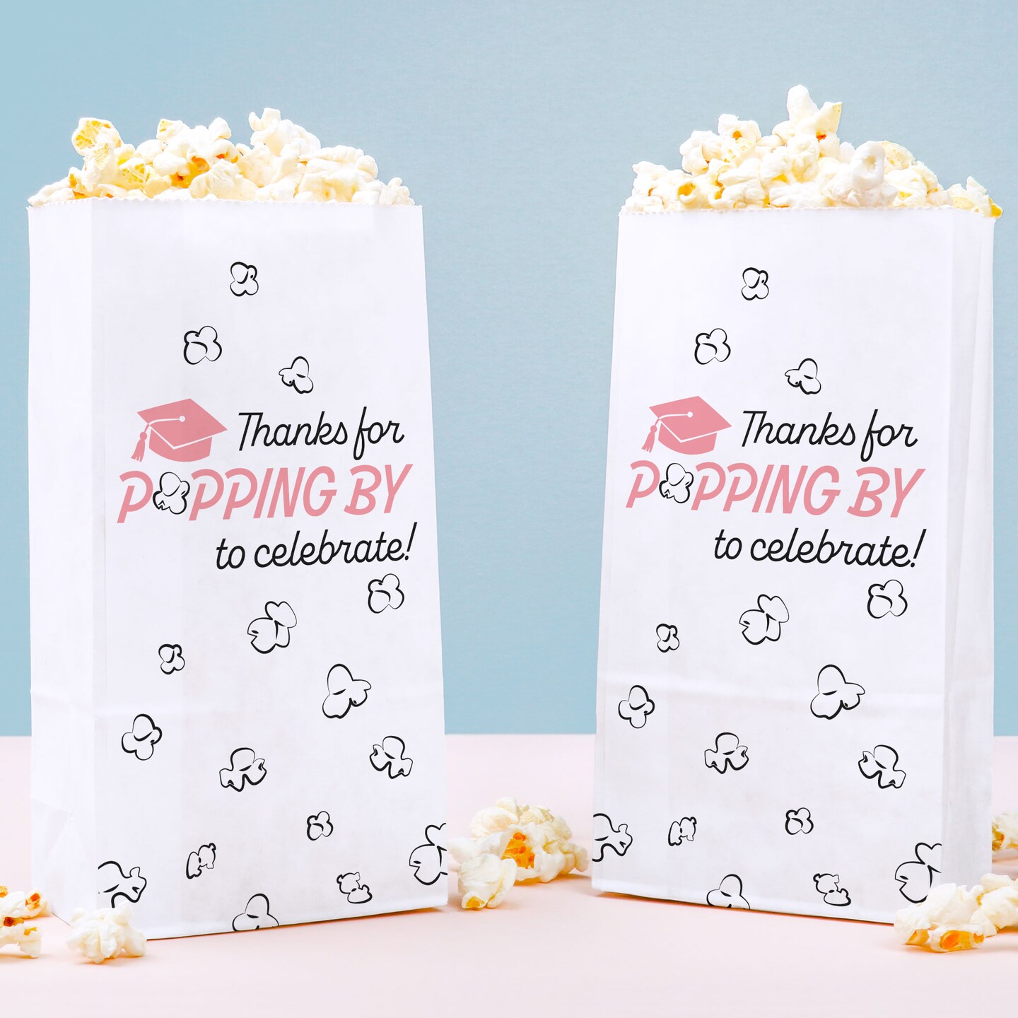Big Dot of Happiness Pink Grad Thanks for Popping by Popcorn Bags, Rose Gold Pink Graduation Favor, Free-Standing Individual White Paper Bags - 25 Ct