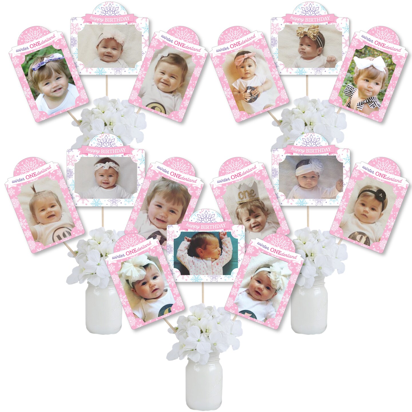 Big Dot of Happiness Pink Snowflakes 1st Birthday - Girl Winter ONEderland Party Picture Centerpiece Sticks - Photo Table Toppers - 15 Pieces