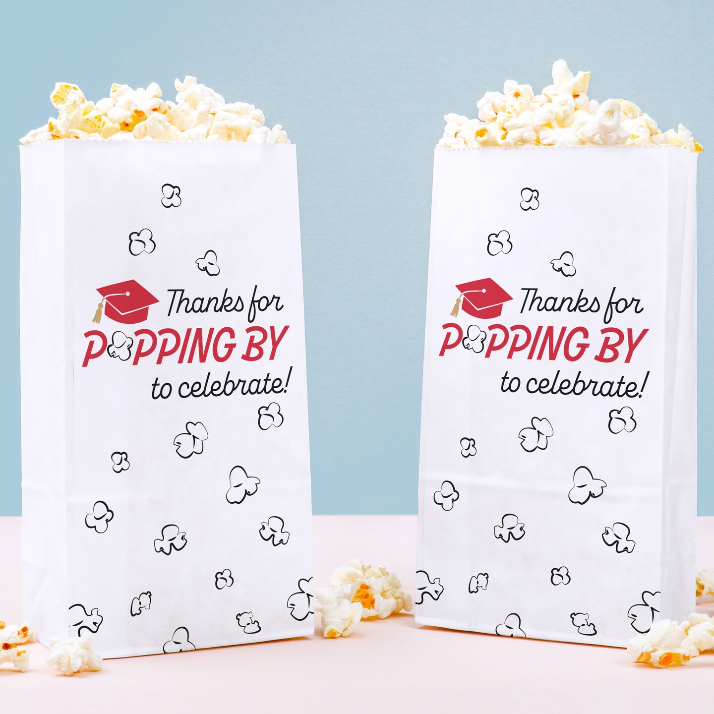 Big Dot of Happiness Red Grad Thanks for Popping by Popcorn Bags, Red Graduation Favor Snack Treats, Free-Standing Individual White Paper Bags - 25 Ct
