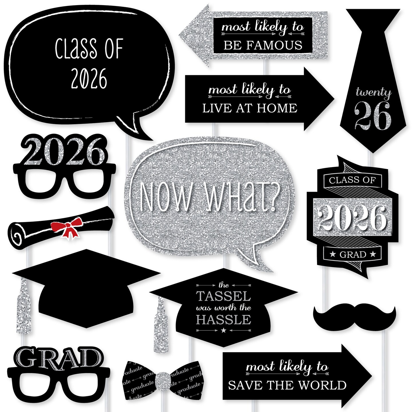Big Dot of Happiness Silver Graduation Party - 2026 Grad Photo Booth Props Kit - 20 Count