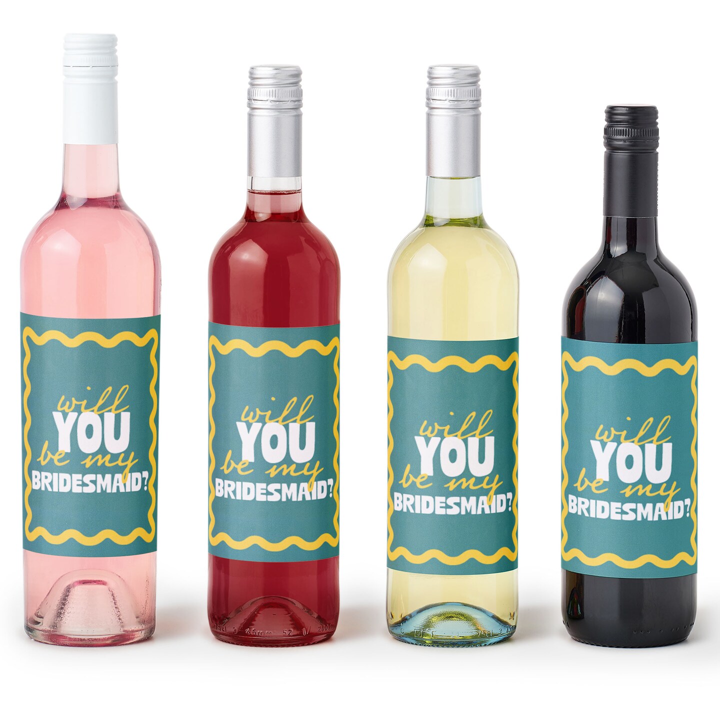 Big Dot of Happiness Teal Green and Yellow Wavy Will You Be My Bridesmaid Wine Labels for Bottles Retro Bridesmaid Proposal Bridal Stickers - Set of 4