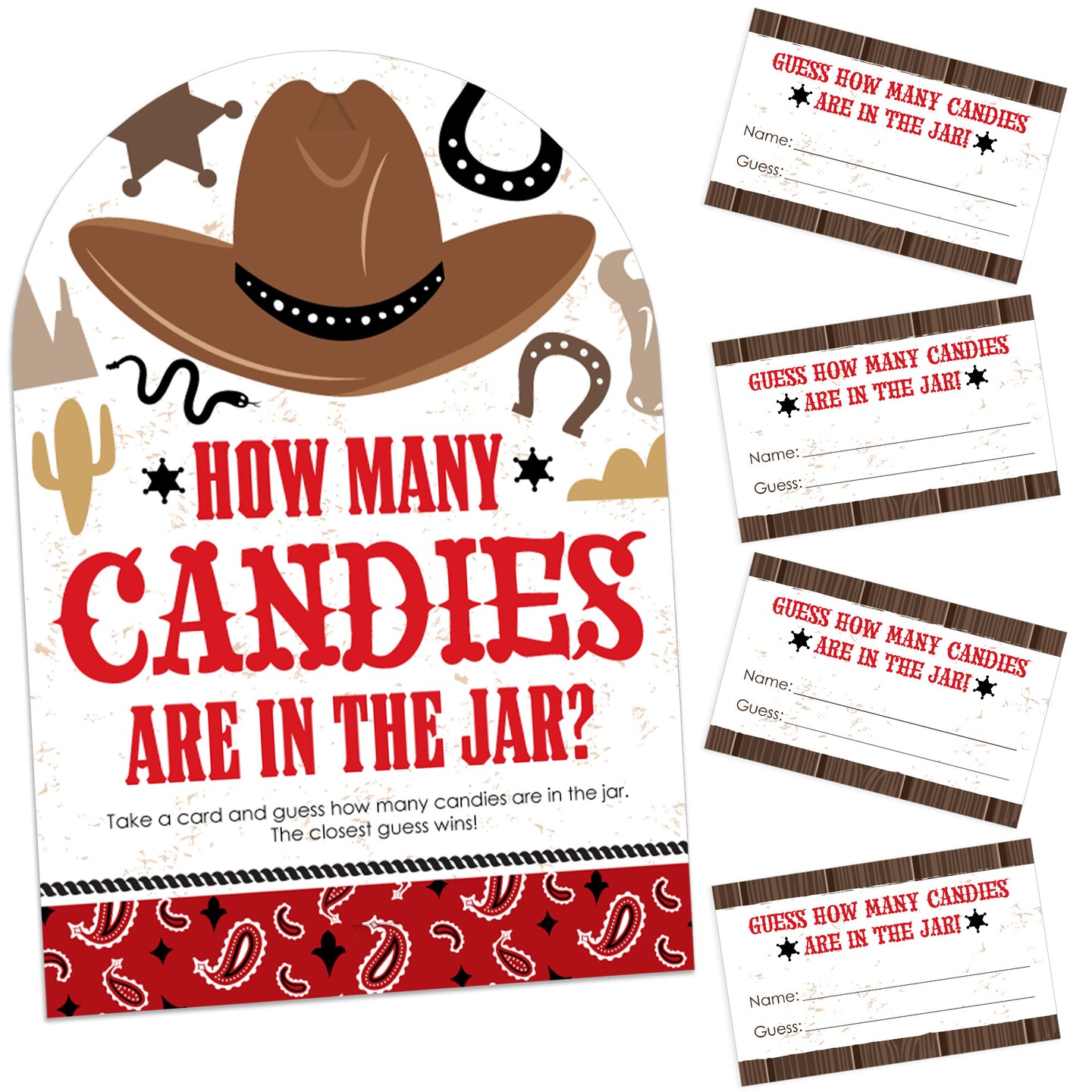 Big Dot of Happiness Western Hoedown - How Many Candies Wild West Cowboy Party Game - 1 Stand and 40 Cards - Candy Guessing Game